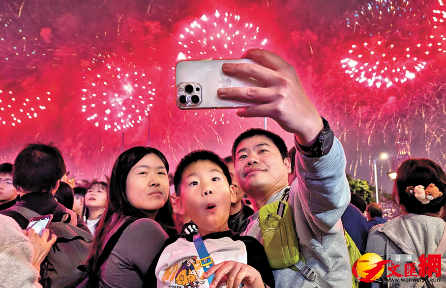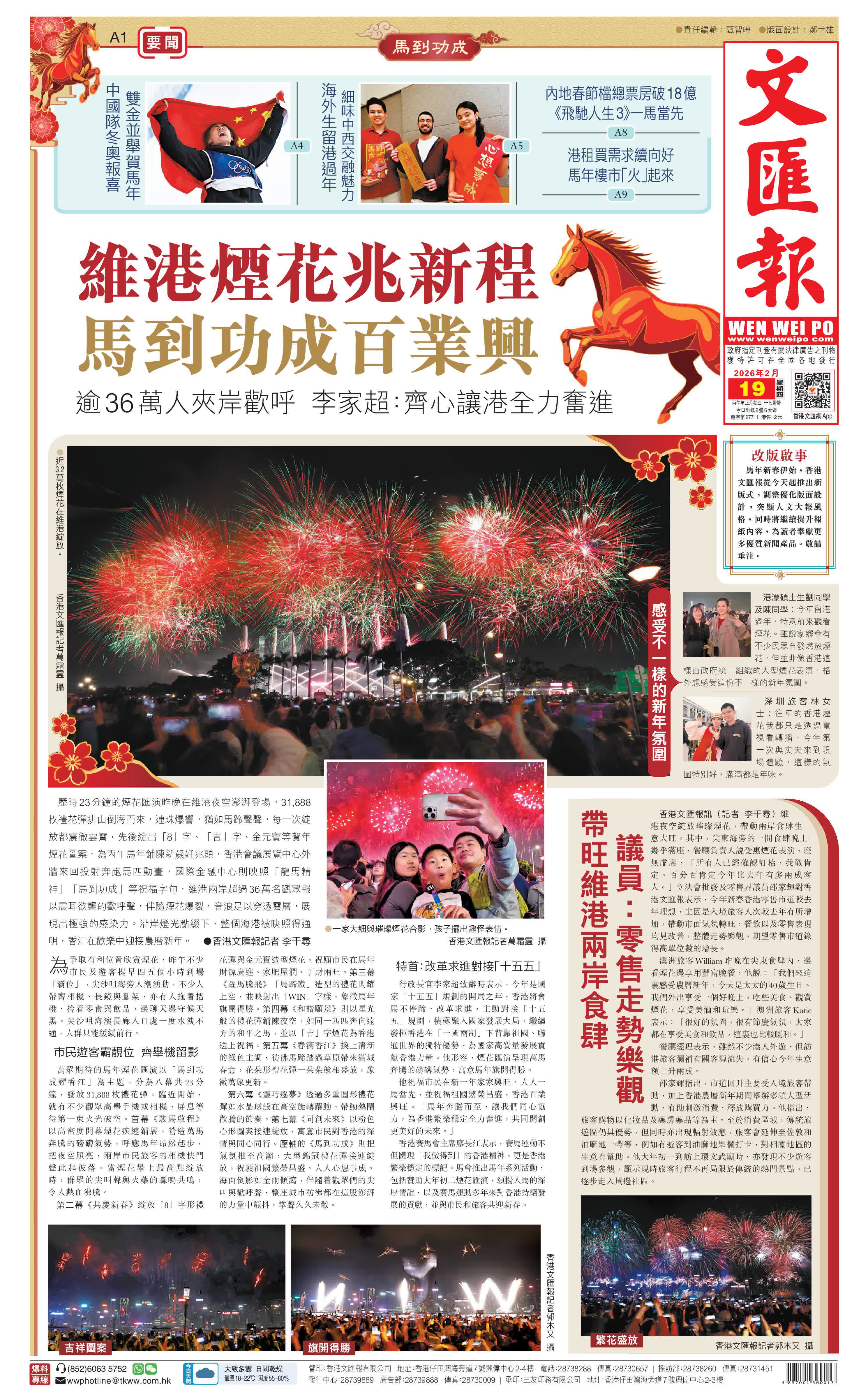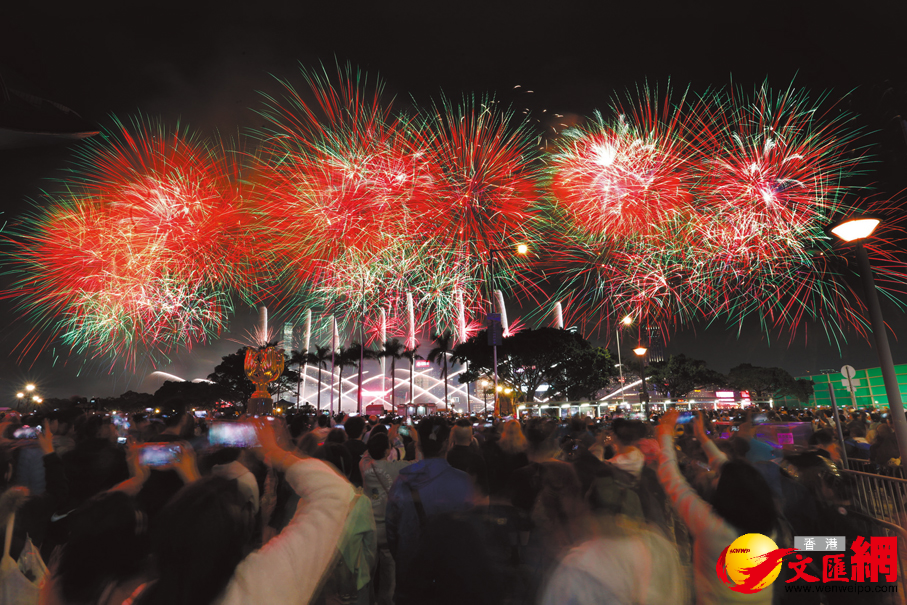 (香港文匯報記者 李千尋)歷時23分鐘的煙花匯演昨晚在維港夜空澎湃登場,31,888枚禮花彈排山倒海而來,連珠爆響,猶如馬蹄聲聲,每一次綻放都震徹雲霄,先後綻出「8」字、「吉」字、金元寶等賀年煙花圖案,為丙午馬年鋪陳新歲好兆頭,香港會議展覽中心外牆來回投射奔跑馬匹動畫,國際金融中心則映照「龍馬精神」「馬到功成」等祝福字句,維港兩岸超過36萬名觀眾報以震耳欲聾的歡呼聲,伴隨煙花爆裂,音浪足以穿透雲層,展現出極強的感染力。沿岸燈光點綴下,整個海港被映照得通明,香江在歡樂中迎接農曆新年。