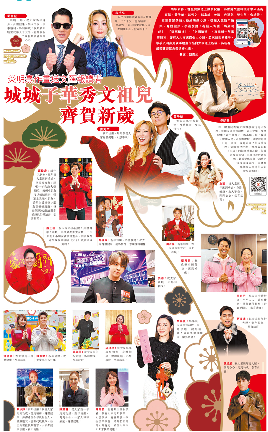 (文:娛樂組)馬年新春,群星齊集送上誠摯祝福,為香港文匯報讀者帶來滿滿喜氣。黃子華、鄭秀文、郭富城、姜濤、容祖兒、蔡少芬、佘詩曼、宣萱等眾多藝人紛紛表達心意,祝願大家新年快樂、身體健康、恭喜發財!有藝人寄語「馬到功成」、「龍馬精神」、「財源滾滾」,寓意新一年事事順利;亦有人大方透露個人心願,並祝願世界和平。歌手炎明熹更親手繪畫作品向大家送上祝福,為新春增添藝術氣息與溫暖心意。
