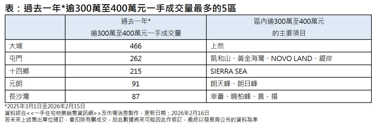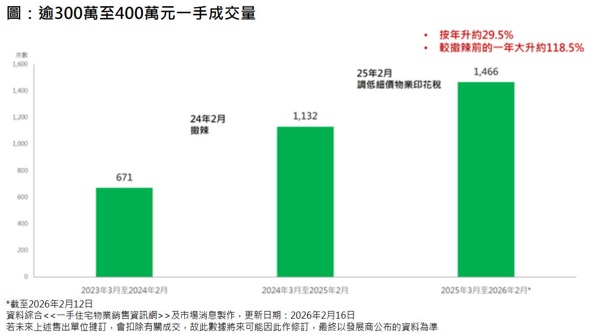 美聯物業分析師岑頌謙指出,據美聯物業研究中心綜合一手住宅物業銷售資訊網資料及市場消息,過去一年(2025年3月至2026年2月15日)逾300萬至400萬元一手成交量共錄1,466宗,較前一年(2024年3月至2025年2月)的1,132宗按年大升約29.5%;比起撤辣前的一年(2023年3月至2024年2月)僅671宗更大升約118.5%(見圖)。