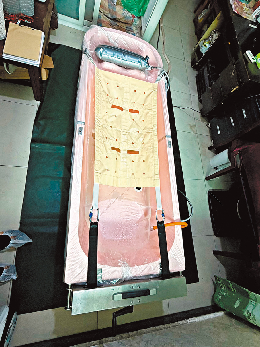邢相彬的家不大,收拾得乾淨整齊。簡單打了招呼後,胡德虎打開背包,開始安裝浴缸——這是一個粉紅色的浴缸,自帶進水管、出水管和淋浴頭,價值一萬多元(人民幣,下同)。「一般來說我們上門是三個人,兩男一女搭配,今天女同事請假了。」他解釋道,女性助浴師親和力強,負責溝通安撫,但今天這位是老客戶,兩位男士也足夠了。
