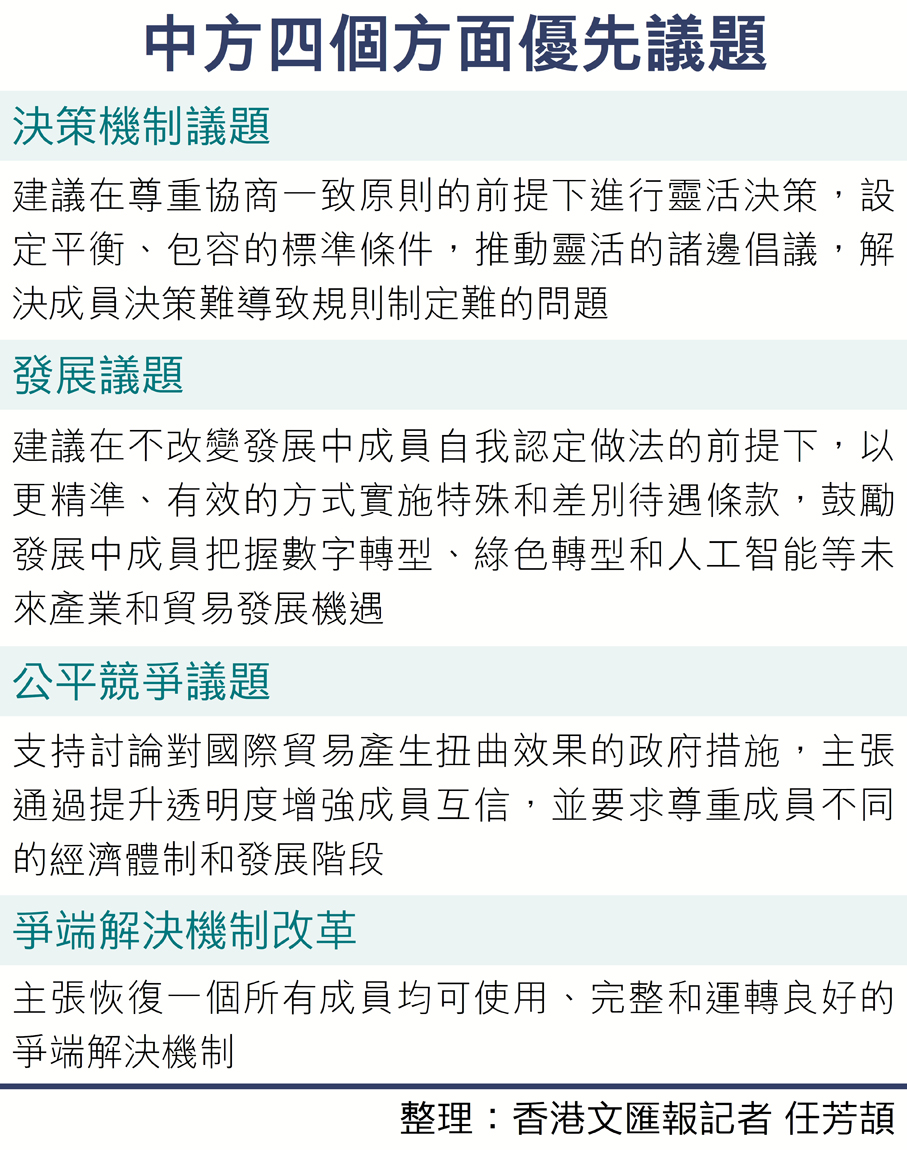 文件強調,工作計劃應從明確決策機制、發展和公平競爭等優先議題着手(詳見附表)。在爭端解決機制改革上,主張恢復一個所有成員均可使用、完整和運轉良好的爭端解決機制。
