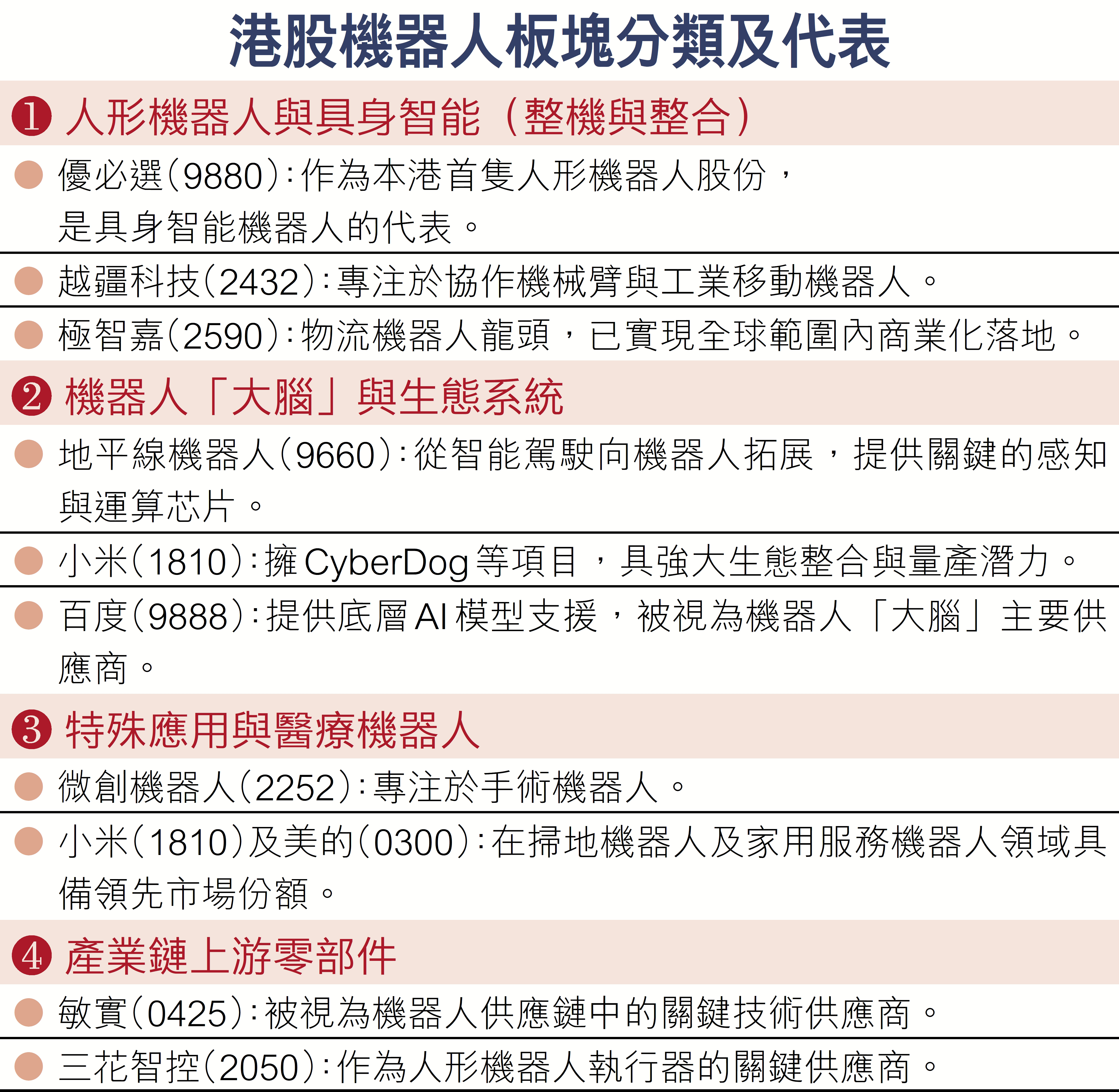 今年春晚演出的機器人來自4間公司,分別是內地機器人「名牌」的宇樹科技、松延動力、魔法原子與銀河通用。該4間公司都有各自的擅長領域,例如宇樹的機器人擁極高的運動性能;松延動力強於消費價格與普及層面;魔法原子是「自研閉環」,90%零件皆為自主研發;至於銀河通用則是偏重工業應用方案。由於該4家公司均未上市集資,故市場料會在現時已上市的股份中尋找「影子股」先行入市。此外,據聞宇樹有可能在今年招股上市,該股已成為全球金融圈所關注的項目,也有助帶動整體股市的積極氣氛。