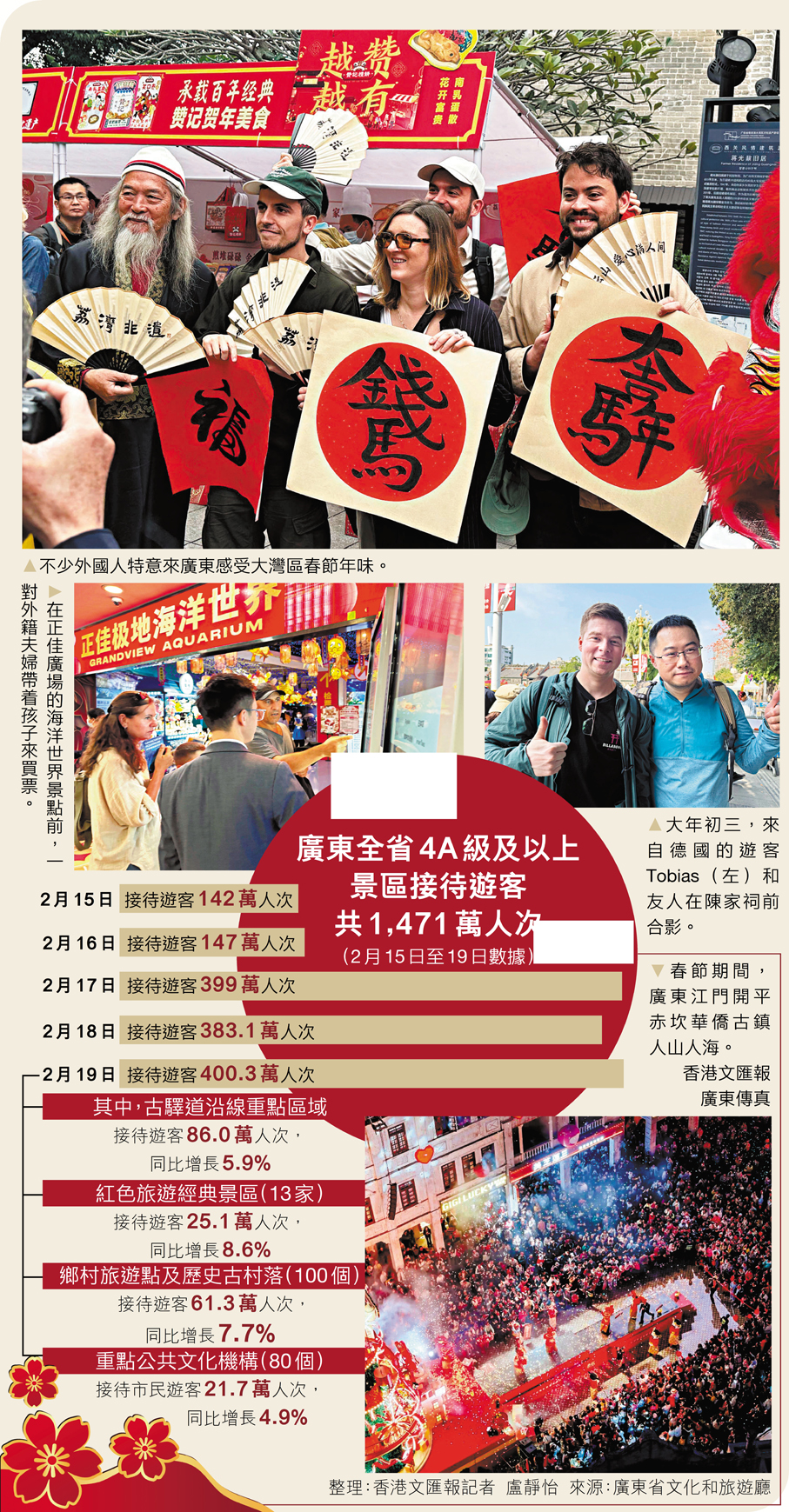 春節期間,廣州陳家祠景區前擺放着一匹以鮮花裝飾而成的「花馬」,吸引不少遊客駐足打卡拍照。走進景區入口,只見排隊入場的人群密密麻麻,蜿蜒人龍數度折返,幾乎看不到盡頭。在陳家祠景點售票處的德國旅客Tobias,拉着行李箱,遙望着長長的人龍感慨不已。「今天是我在廣州最後一天,本來想參觀陳家祠,沒想到中午票就已經賣光了。」他告訴香港文匯報記者,自己來自德國,目前在北京工作,此次趁假期來廣州短途旅行。「人真的太多了,我們準備轉場去永慶坊。」