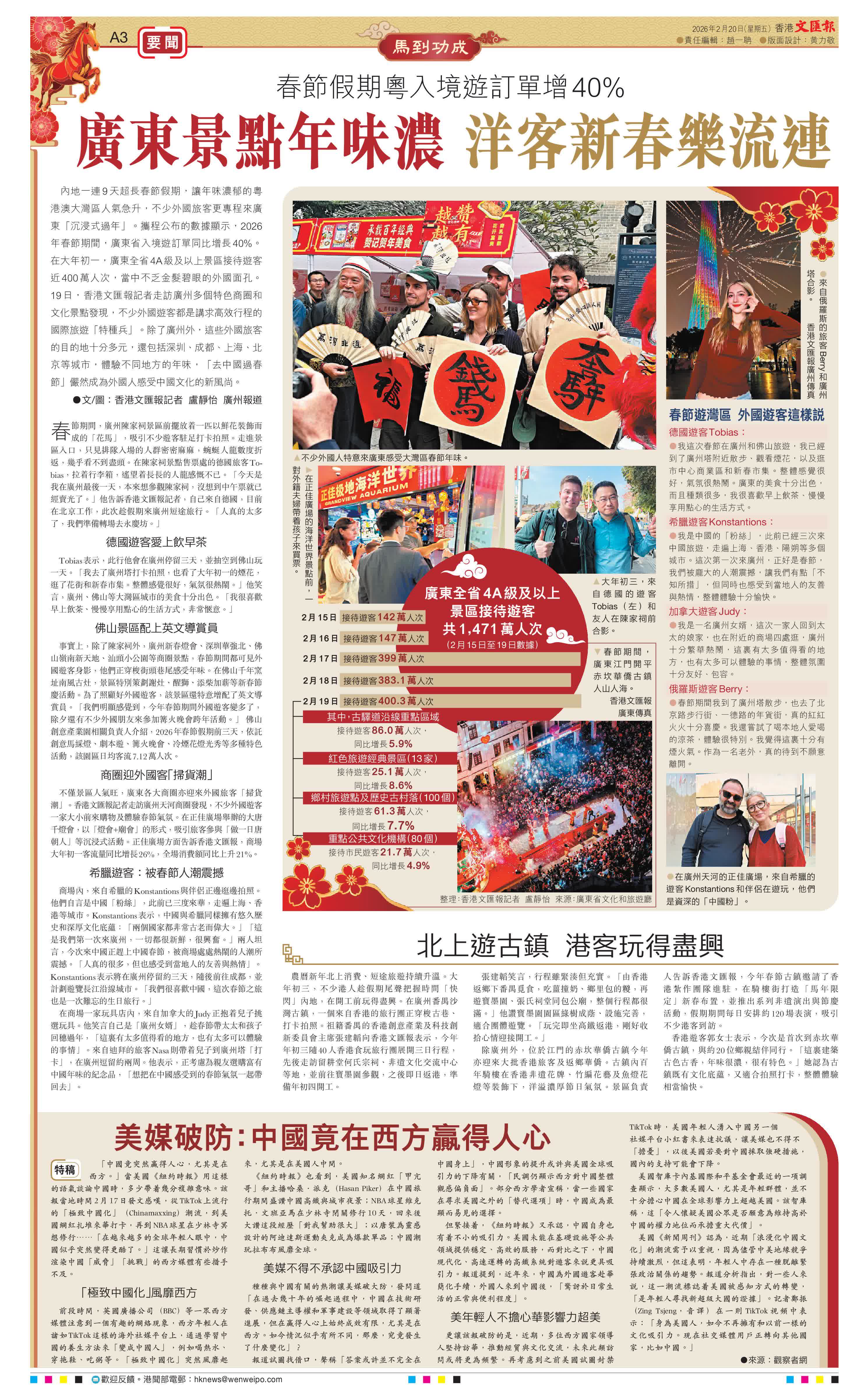 (香港文匯報記者盧靜怡 廣州報道)內地一連9天超長春節假期,讓年味濃郁的粵港澳大灣區人氣急升,不少外國旅客更專程來廣東「沉浸式過年」。攜程公布的數據顯示,2026年春節期間,廣東省入境遊訂單同比增長40%。在大年初一,廣東全省4A級及以上景區接待遊客近400萬人次,當中不乏金髮碧眼的外國面孔。19日,香港文匯報記者走訪廣州多個特色商圈和文化景點發現,不少外國遊客都是講求高效行程的國際旅遊「特種兵」。除了廣州外,這些外國旅客的目的地十分多元,還包括深圳、成都、上海、北京等城市,體驗不同地方的年味,「去中國過春節」儼然成為外國人感受中國文化的新風尚。