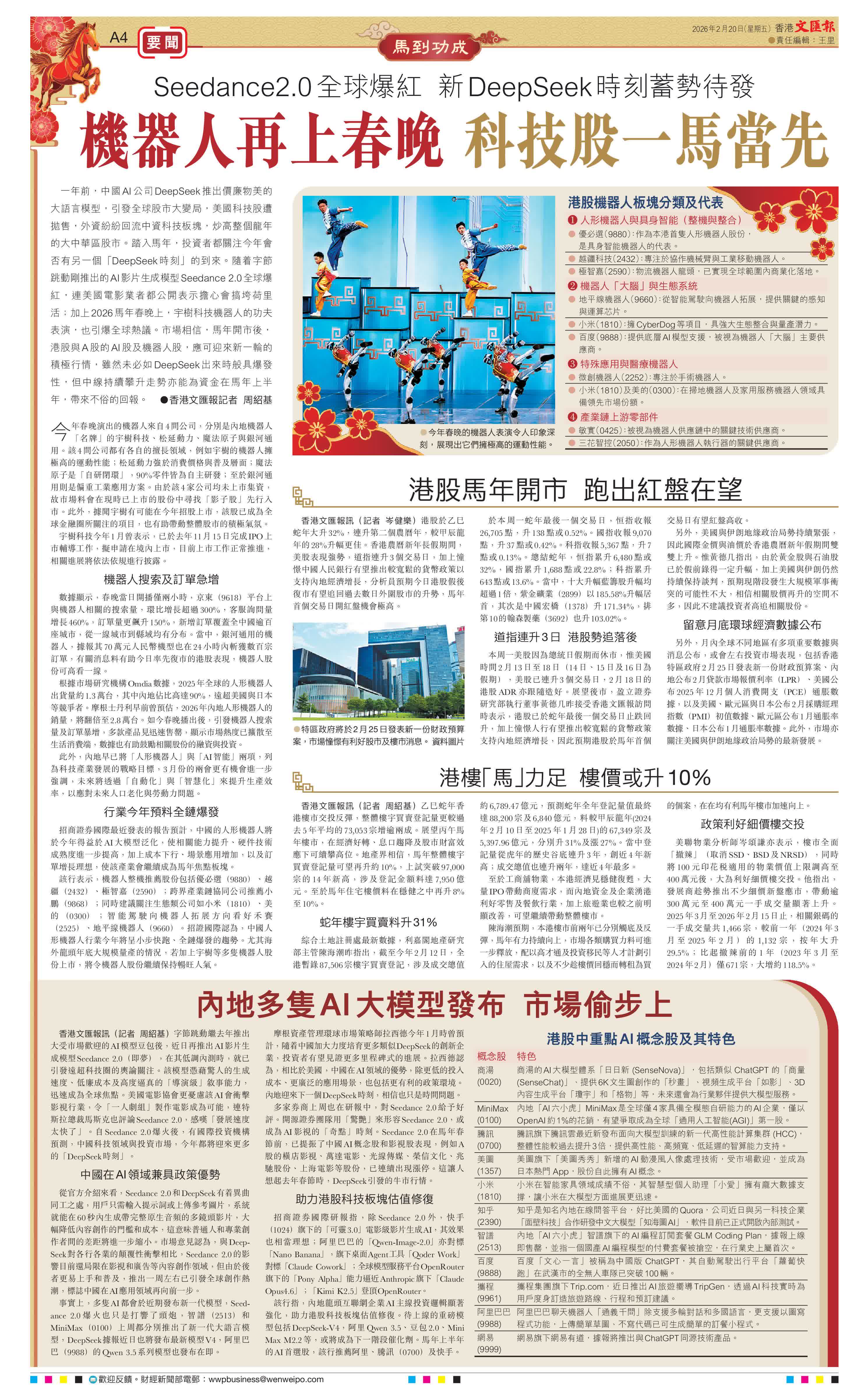 (香港文匯報記者 周紹基)一年前,中國AI公司DeepSeek推出價廉物美的大語言模型,引發全球股市大變局,美國科技股遭拋售,外資紛紛回流中資科技板塊,炒高整個龍年的大中華區股市。踏入馬年,投資者都關注今年會否有另一個「DeepSeek時刻」的到來。隨着字節跳動剛推出的AI影片生成模型Seedance 2.0全球爆紅,連美國電影業者都公開表示擔心會搞垮荷里活;加上2026馬年春晚上,宇樹科技機器人的功夫表演,也引爆全球熱議。市場相信,馬年開市後,港股與A股的AI股及機器人股,應可迎來新一輪的積極行情,雖然未必如DeepSeek出來時般具爆發性,但中線持續攀升走勢亦能為資金在馬年上半年,帶來不俗的回報。