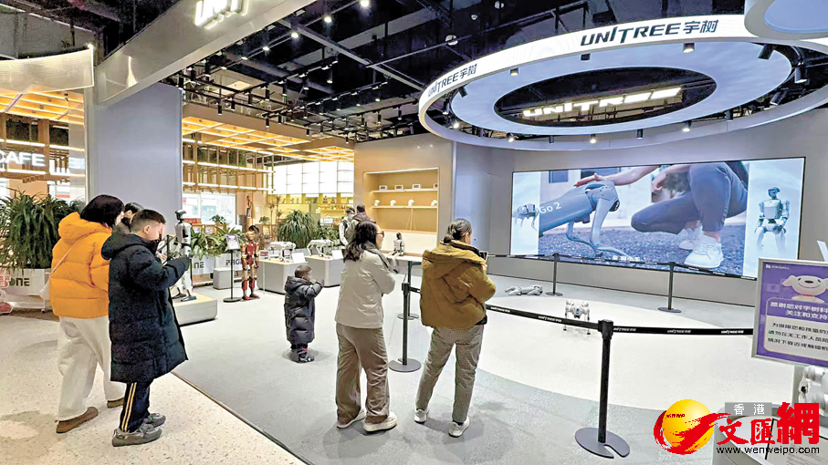 宇樹科技全球首家線下店於今年開年在北京開業,成為推動前沿技術走向消費市場的一個現實樣本。香港文匯報記者現場看到,G1人形機器人、Go2四足機器狗等明星產品集體亮相,機器人演示區更是人頭攢動,伴隨着劉德華《恭喜發財》的經典音樂,機器狗絲滑地完成滑步、倒立、比心等動作演示,引得小朋友拍手稱讚,直呼想買。工作人員對香港文匯報記者表示,開業一個多月以來,家庭客戶堪稱購買主力,尤其定價親民、交互性強的機器狗,已成為贈送給老人和孩子的「新年潮品」。顧客既可以直接在門店提貨,也能掃描商品二維碼,選擇配送到家。