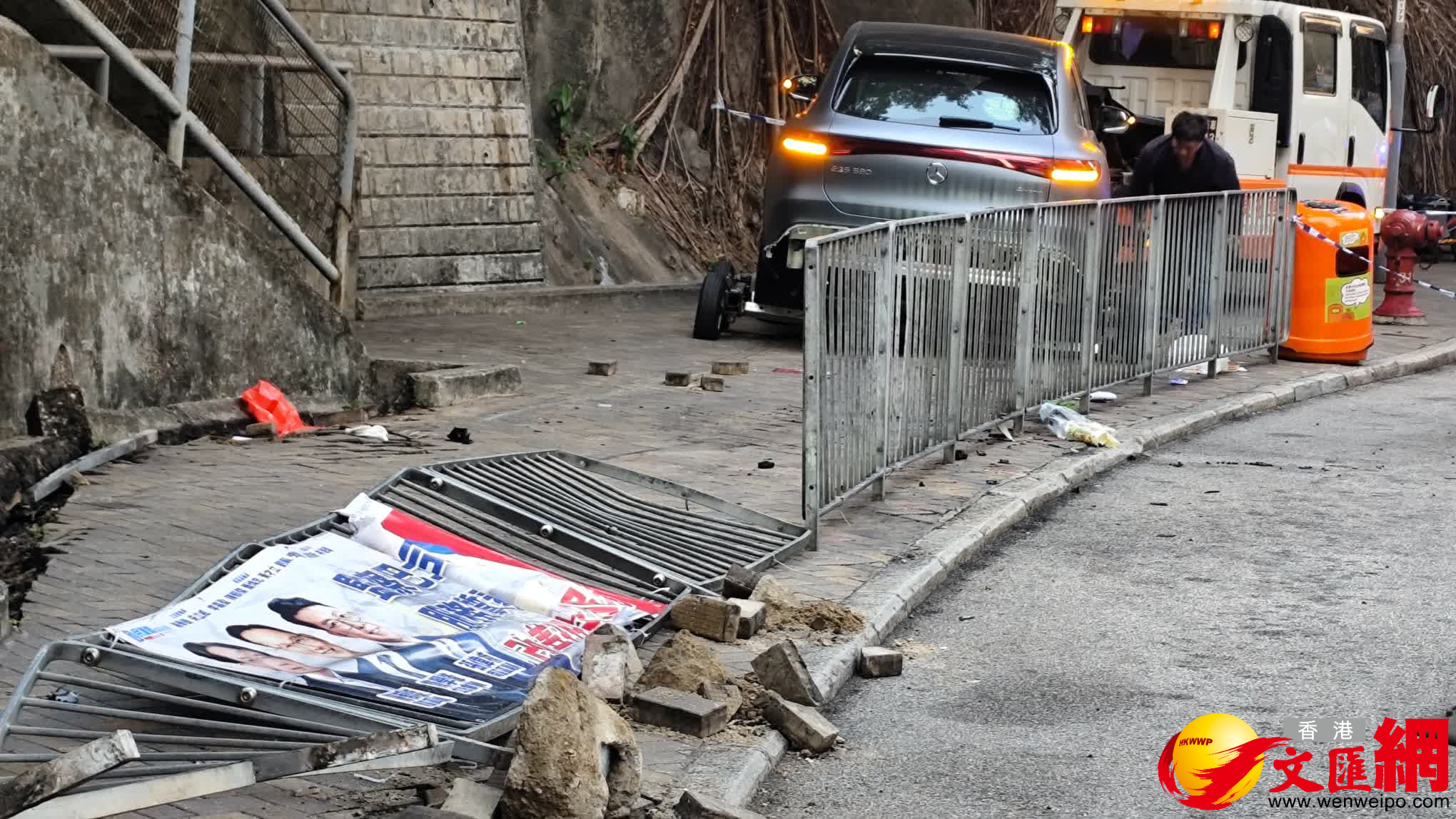 香港文匯報訊(記者 蕭景源)今日(20日)下午4時39分,一輛私家車沿香港仔香港仔大道行駛,當駛至香港仔大道232號對開一個右彎時,突然失控掃欄剷上行人路,並撞倒三男女一家三口,其中25歲女兒被困車底,有南亞外賣員及熱心途人見狀,一度嘗試合力抬車救人。
