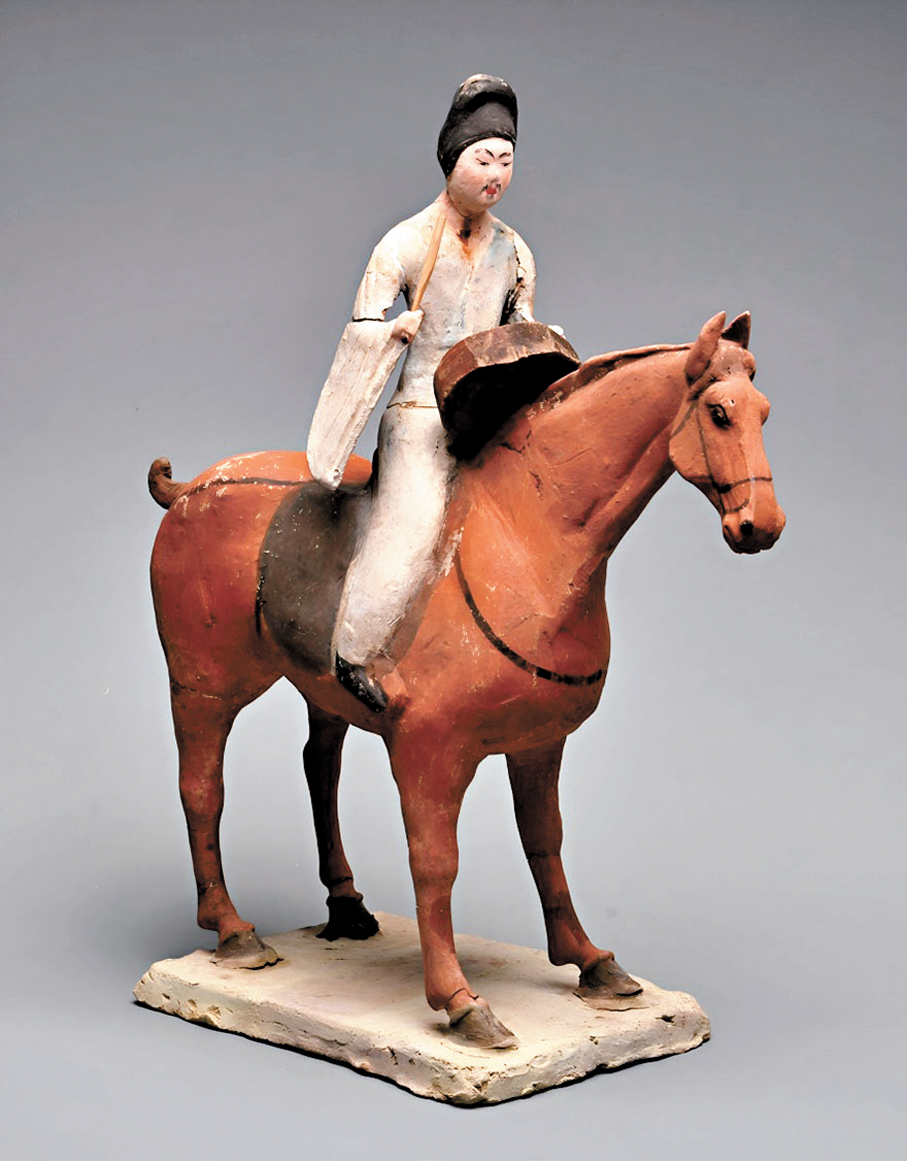 騎馬擊鼓俑出自吐谷渾喜王慕容智墓,葬於武周天授二年(691年),為迄今所見保存最完整的唐代吐谷渾王族墓葬。墓主慕容智係吐谷渾末代可汗之子、唐弘化公主所生,其墓葬形制與隨葬特徵反映了吐谷渾上層在制度、文化上深度融合唐風的歷史進程。該俑頭戴籠冠,身着闊袖白袍,跨坐馬背,懷抱圓鼓,作擊奏狀。棗紅馬匹姿態穩健,尾結半懸,造型生動。俑身以泥質紅陶塑成,內貫鐵芯,表面施彩,細節清晰。此俑屬於墓中儀仗俑群,生動再現唐代軍儀禮樂場景,既體現吐谷渾對中原葬儀的採納,亦展現了馬在絲路文化交流中的禮儀功能與藝術表現。 紅綠彩騎馬女像則屬小型陶塑,造型生動、釉彩各異,體現了民間窯口的質樸趣味與生活氣息。紅綠彩騎馬女像以紅、綠、黑彩繪飾,女子騎姿端莊,面容清秀,再現了宋金時期女子出行的嫻雅風姿。馬在中國古代社會中地位重要,深受人們喜愛,因而成為陶瓷創作中常見的表現題材。這些器物不僅承載了工匠的巧思,也使馬這一經典形象通過藝術的形式長久流傳。