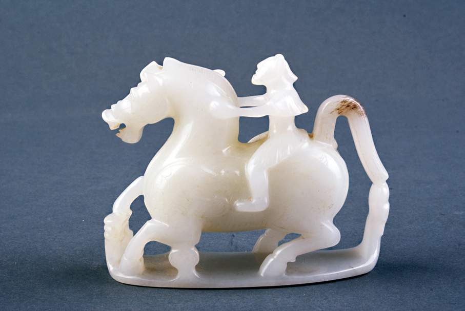 圓雕白玉仙人奔馬以新疆和田羊脂白玉雕成,玉質瑩潤,以圓雕、透雕技法為主,輔以精細線刻,工藝卓絕。有翼神獸在漢代信仰與藝術中廣泛流行,人們視其為能夠辟邪護佑、溝通天地的祥瑞象徵。本品將天馬與仙人意象完美結合,生動詮釋了漢人「天馬行空」的浪漫想像與「羽化登仙」的永恒祈願,為漢代玉器圓雕中的珍罕之作。
