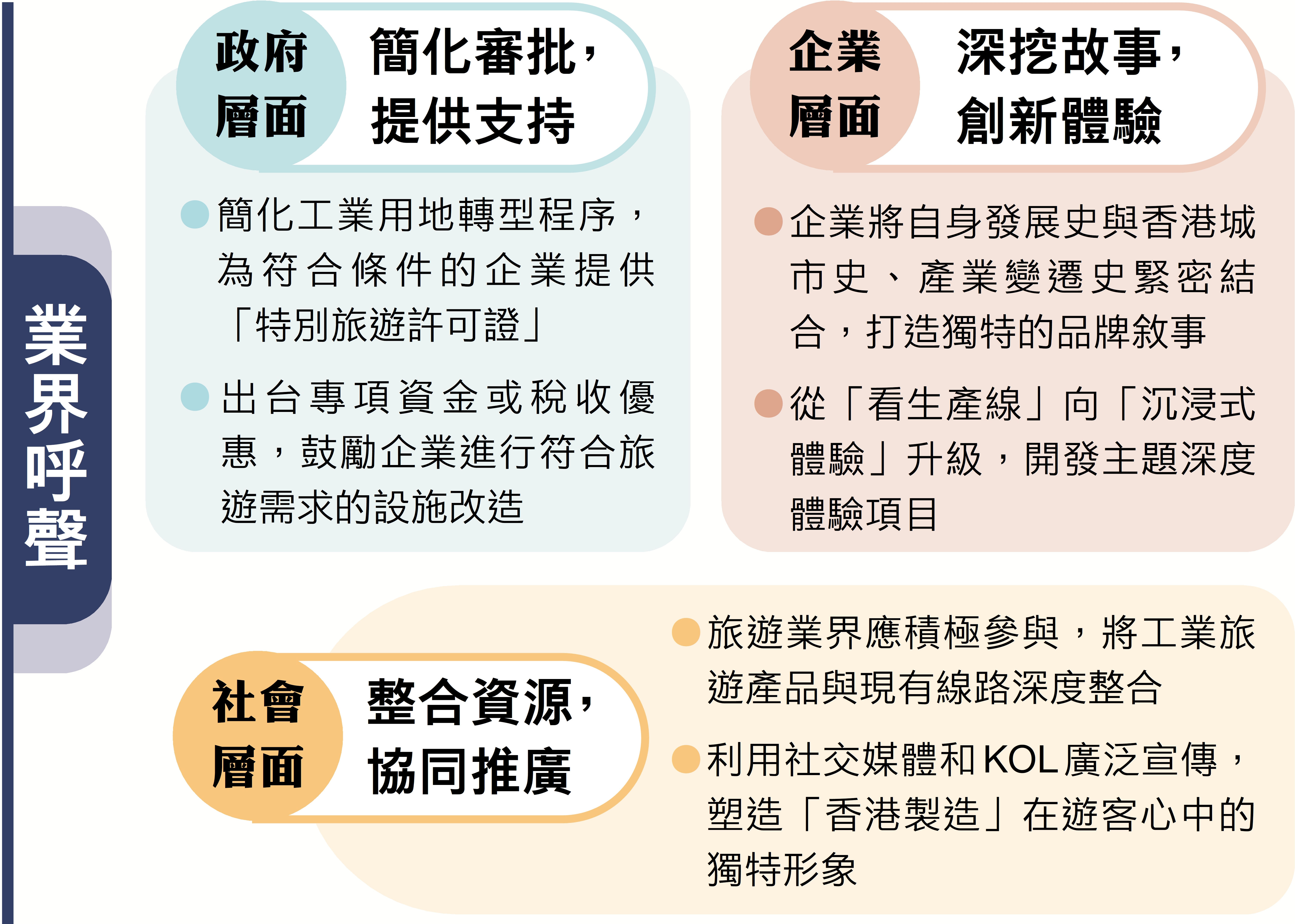 至於實施方面,現時企業的規模較小,且多為私人或民間公司,鄺家麒建議政府可從政策和資金層面提供支持,例如鼓勵企業建立展示館或提升設施的安全與便利性。這不僅有助於企業品牌塑造,也促進社會公共資源的利用與文化資產的保存。對於企業可能因運營考量而不願意公開內部設施,可以由政府提供協調,協助申請參觀許可、提供資金或補貼,並設立專門的展示空間,如工業博物館,將企業的歷史與文化系統性地展現出來。