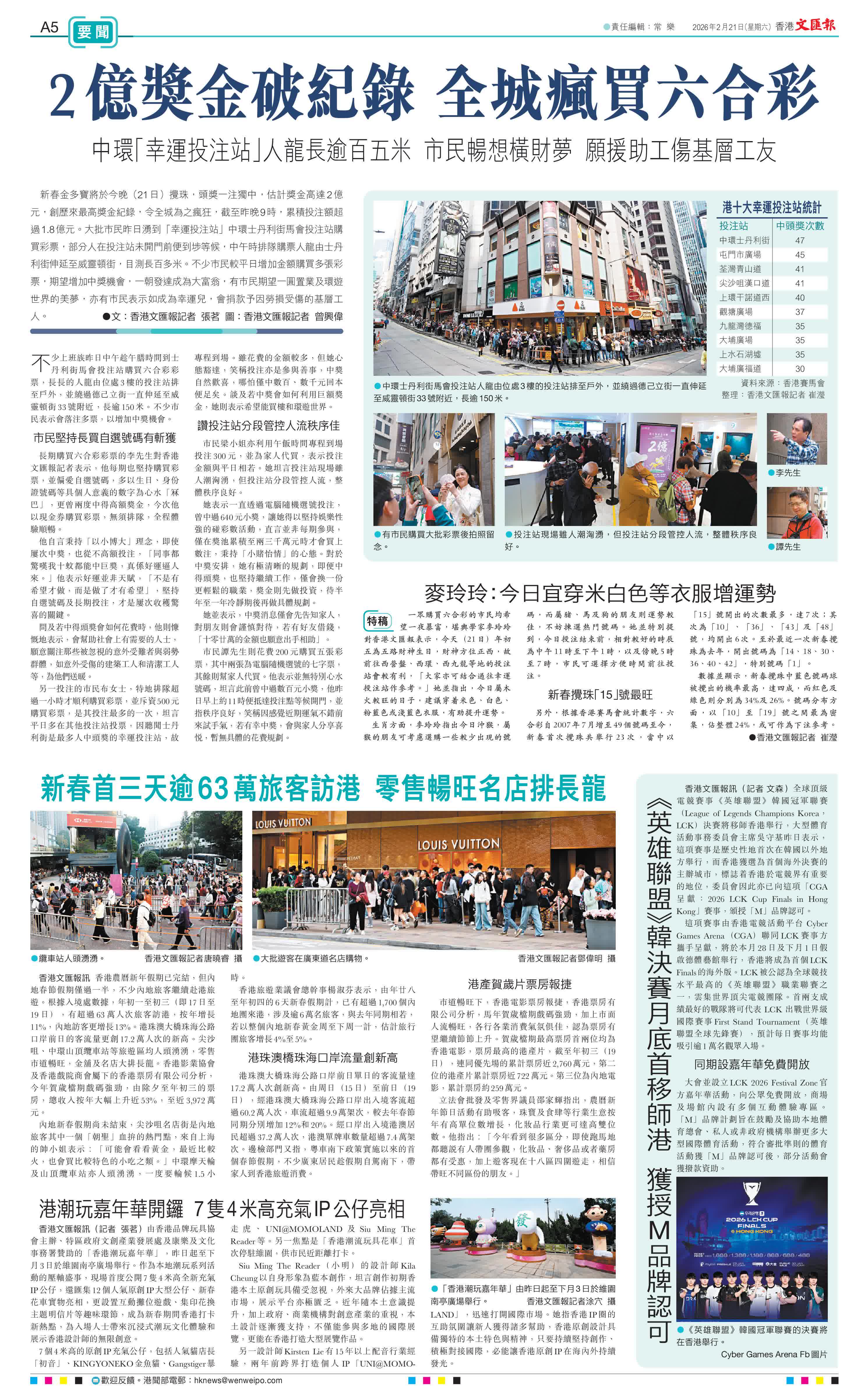 另一投注的巿民布女士,特地排隊超過一小時才順利購買彩票,並斥資500元購買彩票,是其投注最多的一次,坦言平日多在其他投注站投票,因聽聞士丹利街是最多人中頭獎的幸運投注站,故專程到場。雖花費的金額較多,但她心態豁達,笑稱投注亦是參與善事,中獎自然歡喜,哪怕僅中數百、數千元回本便足矣。談及若中獎會如何利用巨額獎金,她則表示希望能買樓和環遊世界。