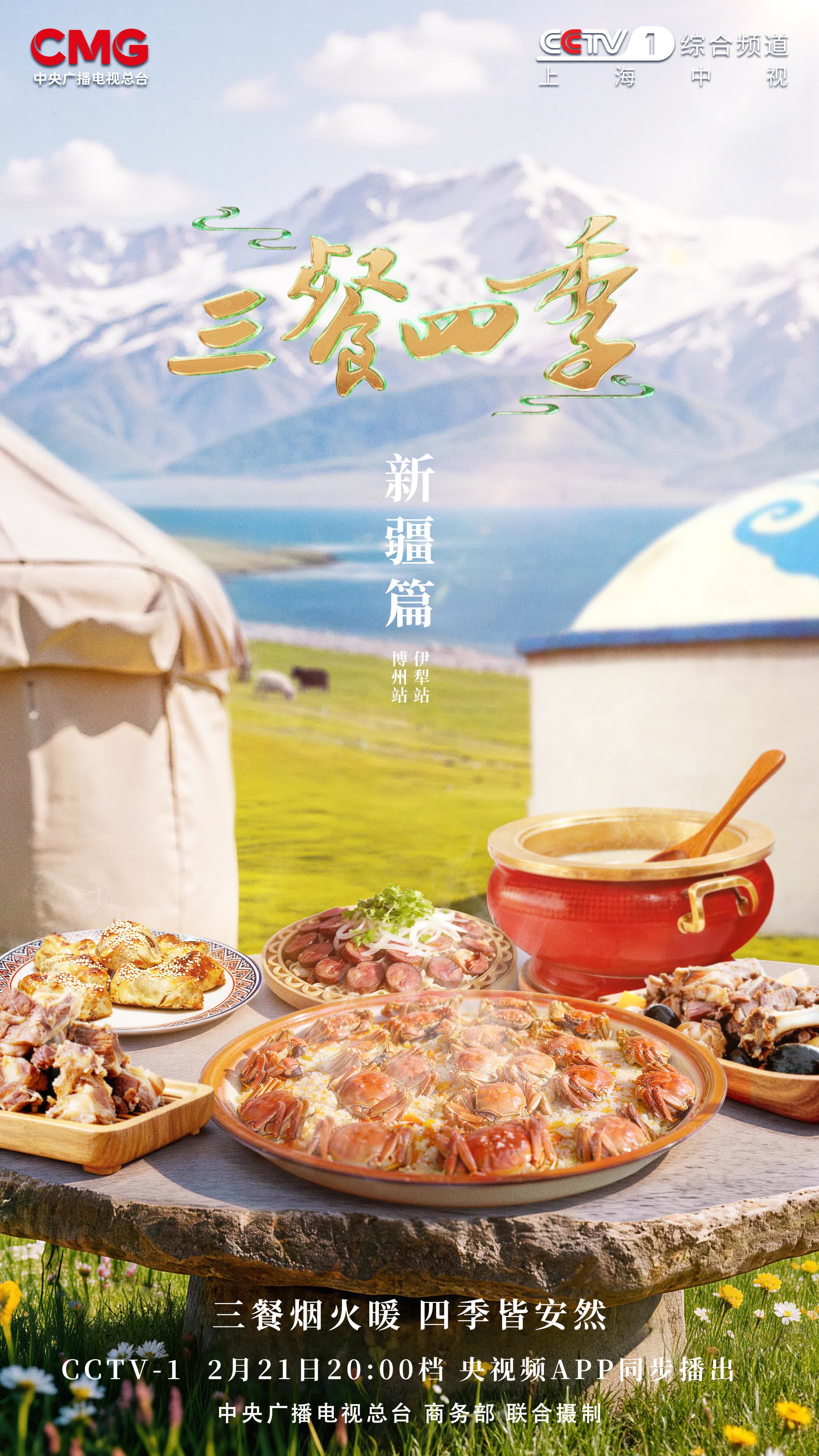 2月21日20點檔,中央廣播電視總台央視綜合頻道大型美食文旅節目《三餐四季》走進新疆,主持人撒貝寧、馬凡舒攜手美食家莊臣,文化嘉賓劉亮程、李穎超組成尋味團,踏上這片神奇的土地,走進被譽為「塞外江南」的伊犁河谷和「青色草原」博爾塔拉蒙古自治州,開啟一場視覺與味覺的雙重盛宴。