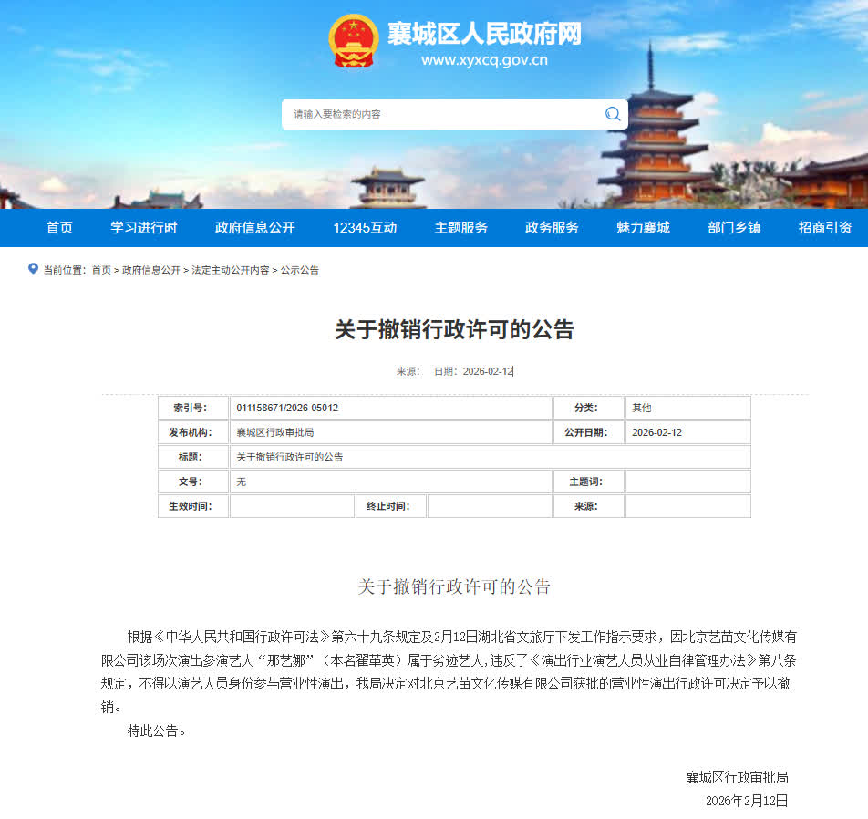 根據《中華人民共和國行政許可法》第六十九條規定及2月12日湖北省文旅廳下發工作指示要求,因北京藝苗文化傳媒有限公司該場次演出參演藝人「那藝娜」(本名翟革英)屬於劣跡藝人,違反了《演出行業演藝人員從業自律管理辦法》第八條規定,不得以演藝人員身份參與營業性演出,我局決定對北京藝苗文化傳媒有限公司獲批的營業性演出行政許可決定予以撤銷。