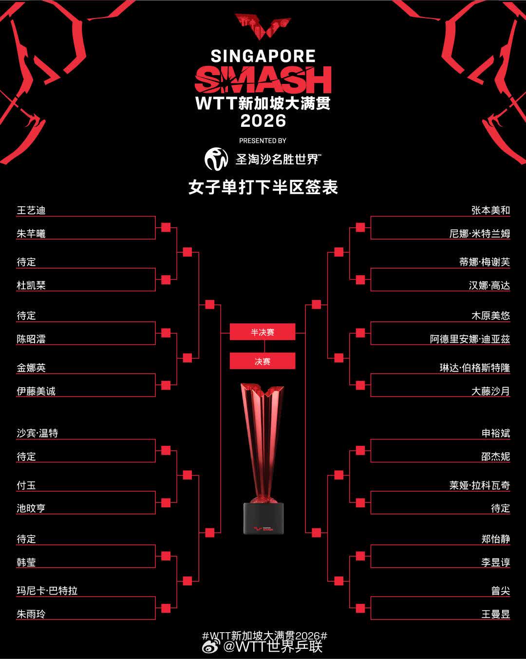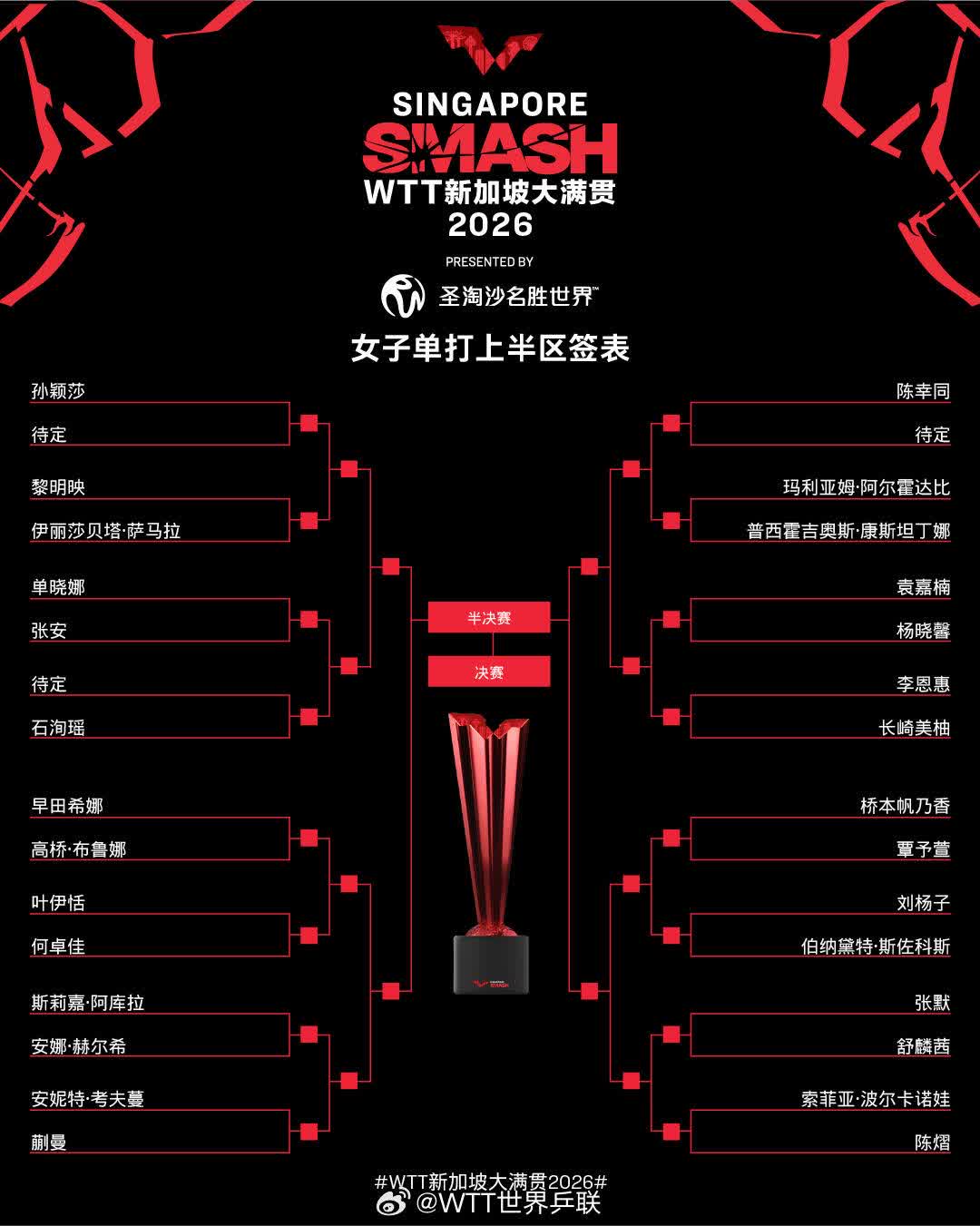 國乒7位選手集中在上半區,孫穎莎、陳幸同首輪均對陣資格賽選手。下半區僅有兩位國乒選手,王曼昱首輪對陣新加坡選手曾尖,王藝迪的對手是韓國選手朱芊曦。詳細簽表如下: