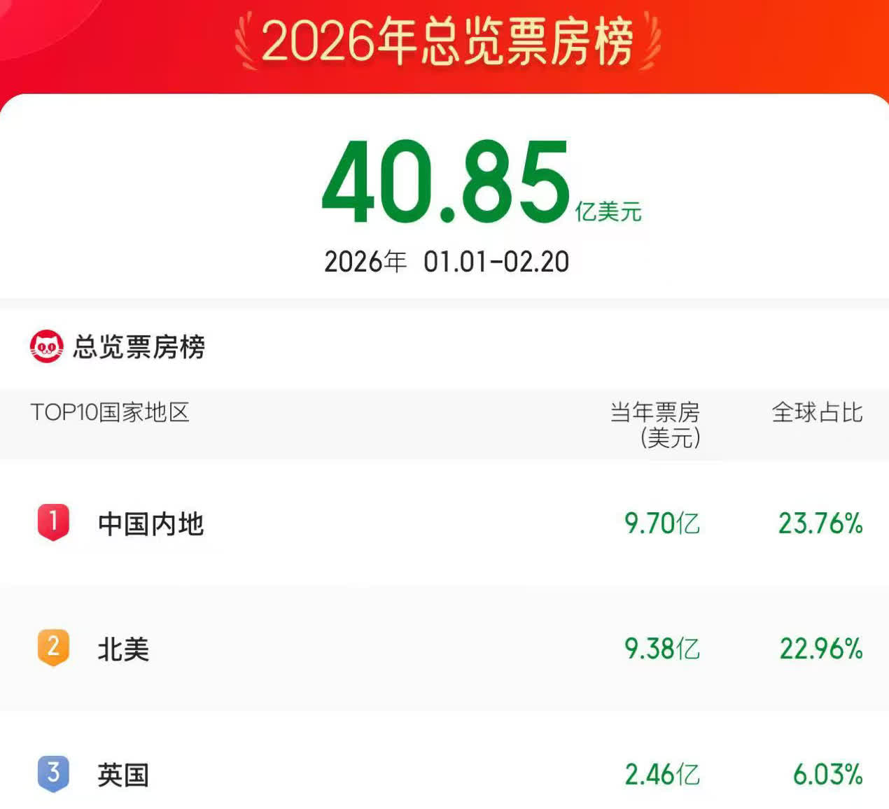 此外,據網絡平台數據顯示,2026年中國電影市場累計票房超9.70億美元,超北美票房成績,暫列全球單一市場票房冠軍。