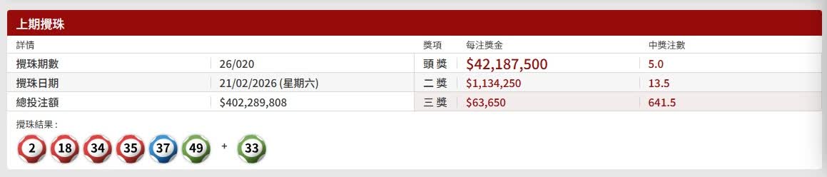頭獎5注中,每注獎金$42,187,500;二獎13.5注中,每注獎金$1,134,250;三獎641.5注中,每注獎金$63,650。