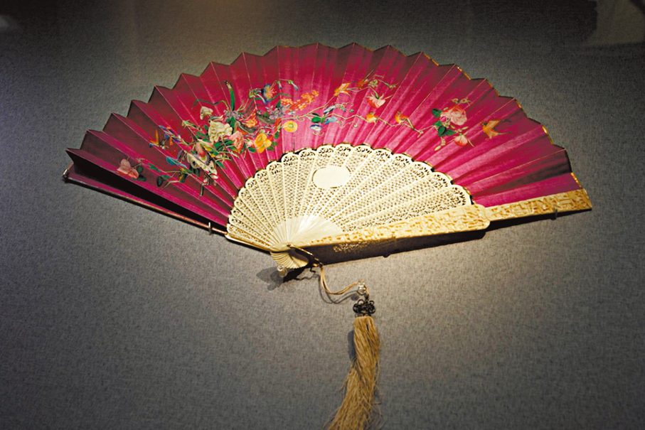 清代象牙骨雕徽章留白綾面彩繪人物花鳥摺扇造型獨特,一面是彩繪花鳥,色澤濃艷;另一面是傳統繪畫庭院人物,設色清雅。據介紹,18世紀、19世紀,廣州外銷扇風靡歐美,身着華麗晚禮服的貴婦都以手執一柄小巧精緻、極具東方韻味的扇子為時尚。摺扇還逐漸發展出一套「扇語」,女子以開合、遮掩、搖動等動作傳遞情感暗號。