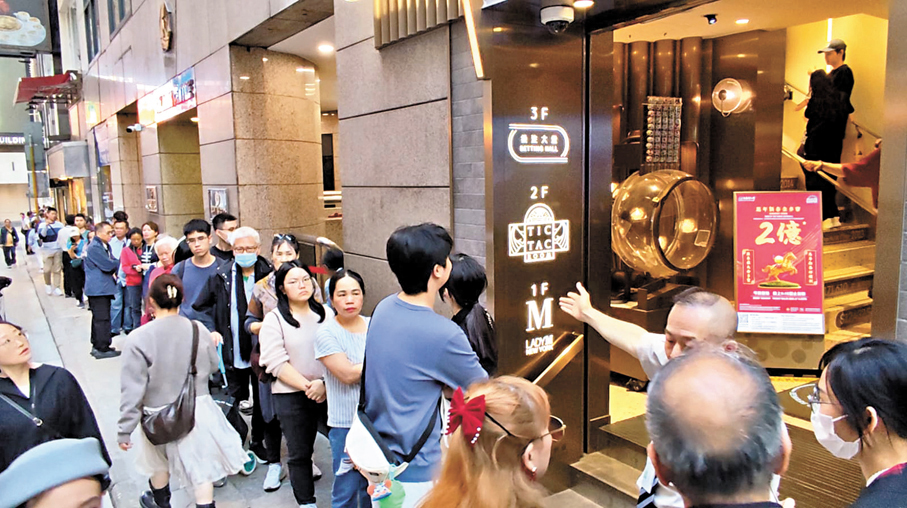 昨晚攪珠的六合彩引起全城關注,各區的馬會投注站也擠滿購買六合彩彩票的市民,當中曾有最多人中頭獎的幸運投注站─中環士丹利街馬會投注站,昨日未開門便排起人龍,高峰時連續兩天人龍由士丹利街繞過德己立街伸延至威靈頓街,人龍較前日更長,由於不少市民特意到該投注站購買彩票,輪候約需3小時。
