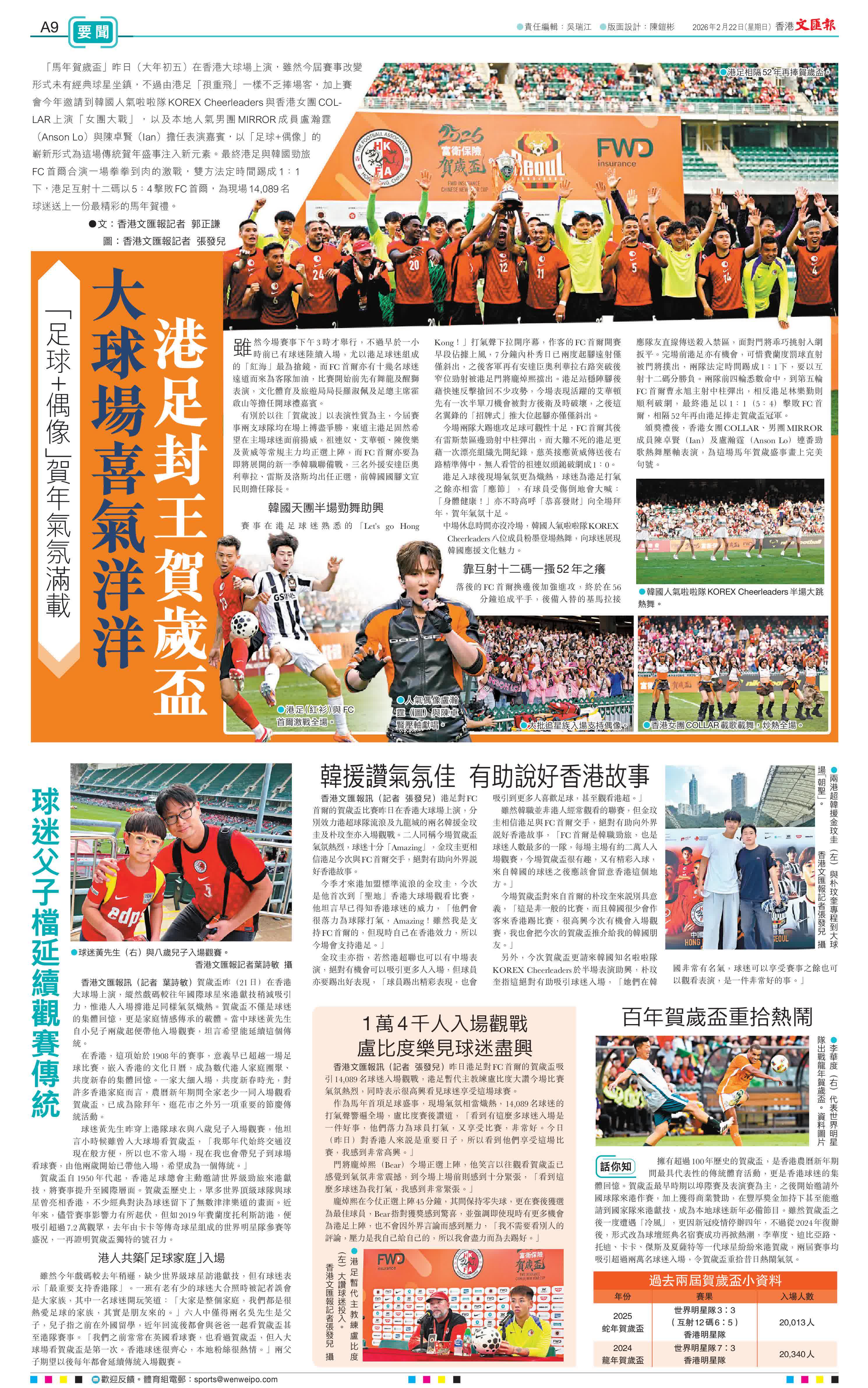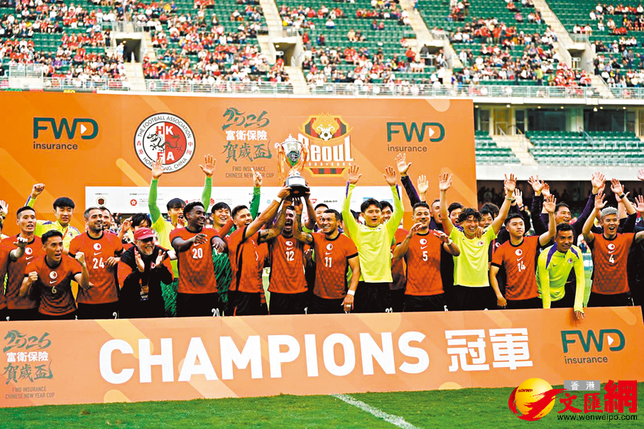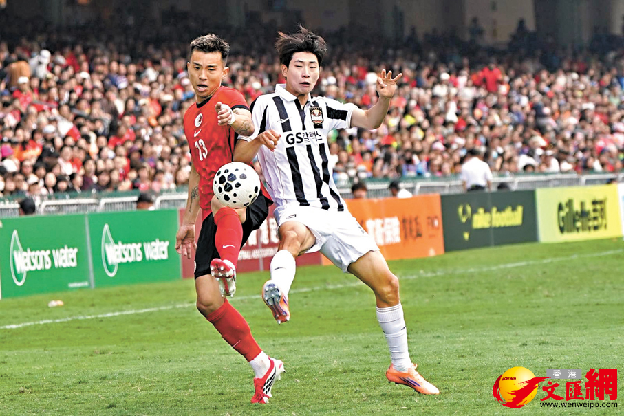 (香港文匯報記者 郭正謙)「馬年賀歲盃」昨日(大年初五)在香港大球場上演,雖然今屆賽事改變形式未有經典球星坐鎮,不過由港足「孭重飛」一樣不乏捧場客,加上賽會今年邀請到韓國人氣啦啦隊KOREX Cheerleaders與香港女團COLLAR上演「女團大戰」,以及本地人氣男團MIRROR成員盧瀚霆(Anson Lo)與陳卓賢(Ian)擔任表演嘉賓,以「足球+偶像」的嶄新形式為這場傳統賀年盛事注入新元素。最終港足與韓國勁旅FC首爾合演一場拳拳到肉的激戰,雙方法定時間踢成1:1下,港足互射十二碼以5:4擊敗FC首爾,為現場14,089名球迷送上一份最精彩的馬年賀禮。