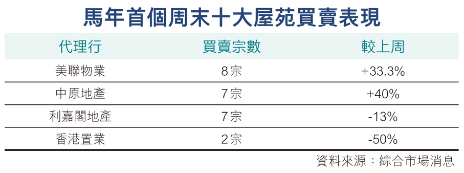 香港文匯報訊 受農曆新年傳統節日因素影響,部分市民仍忙於拜年聚會及出外旅遊,加上市場普遍觀望本周三(25日)出爐的新一份財政預算案會否有提振樓市的措施出台,馬年首個周末(21日至22日)二手住宅成交靜局,各代理統計十大屋苑買賣個案皆為單位數,由8宗至2宗(見表)不等。