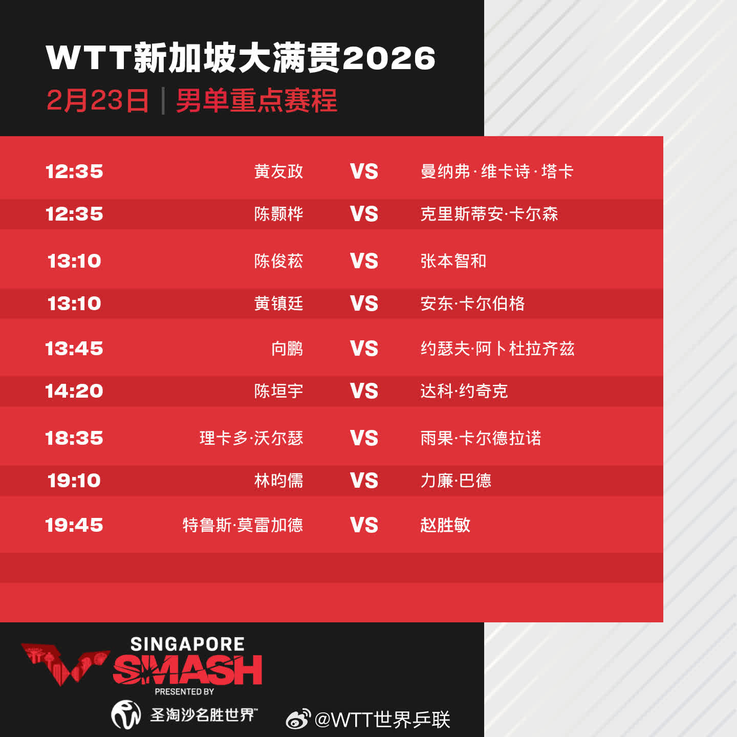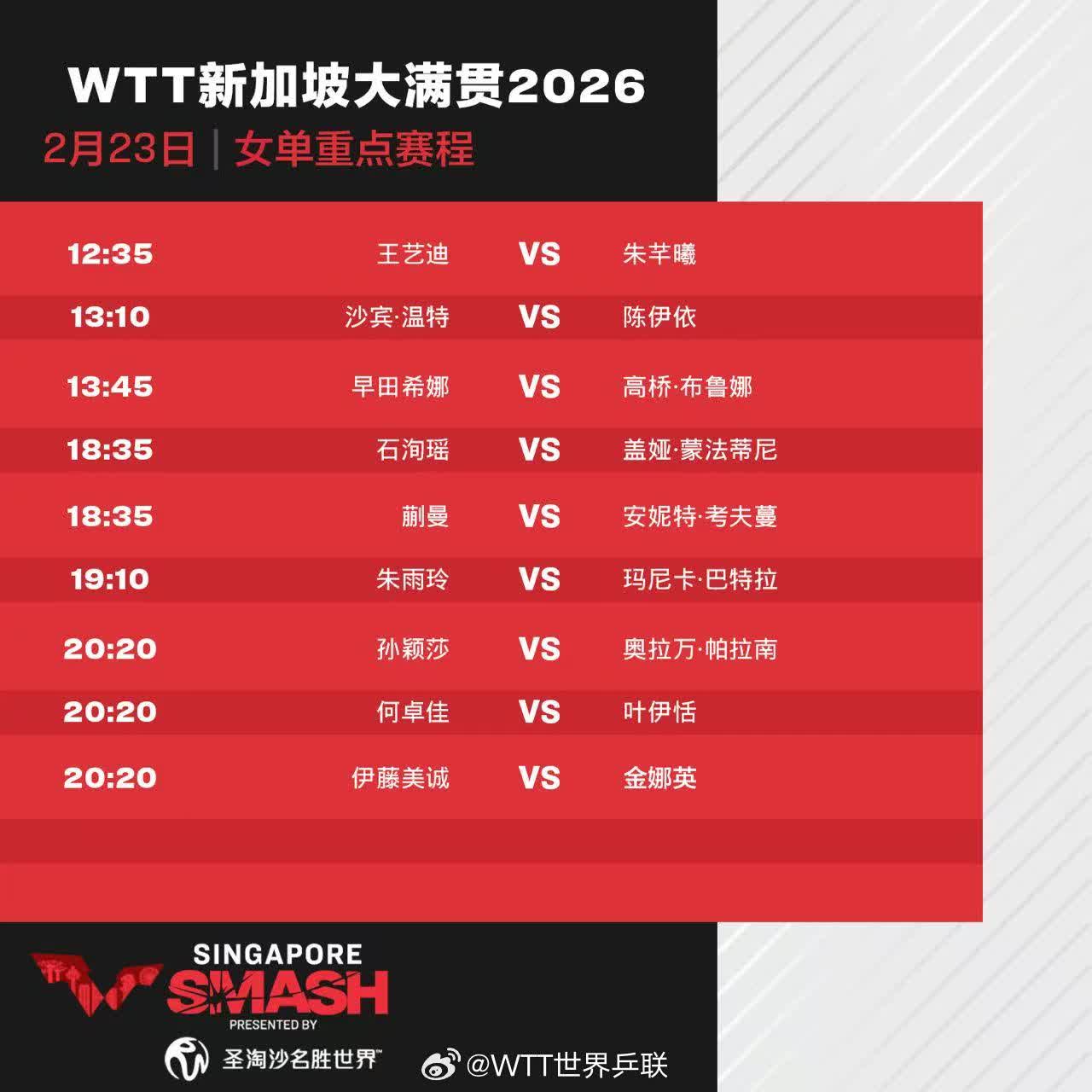 今天(23日),2026年WTT新加坡大滿貫進入正賽第二天,孫穎莎、蒯曼、王藝迪、向鵬和陳垣宇等出場。