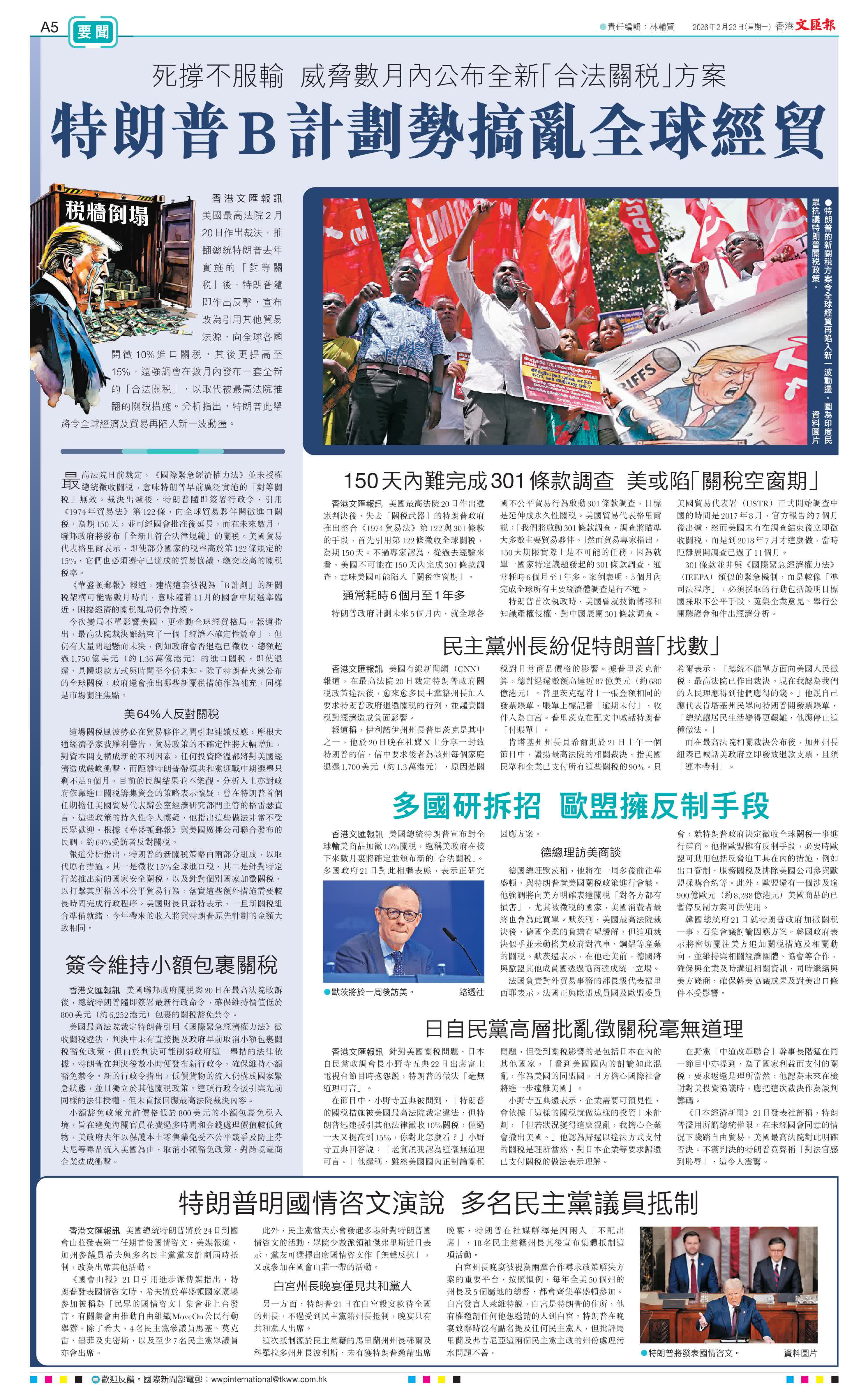最高法院日前裁定,《國際緊急經濟權力法》並未授權總統徵收關稅,意味特朗普早前廣泛實施的「對等關稅」無效。裁決出爐後,特朗普隨即簽署行政令,引用《1974年貿易法》第122條,向全球貿易夥伴開徵進口關稅,為期150天,並可經國會批准後延長,而在未來數月,聯邦政府將發布「全新且符合法律規範」的關稅。美國貿易代表格里爾表示,即使部分國家的稅率高於第122條規定的15%,它們也必須遵守已達成的貿易協議,繳交較高的關稅稅率。