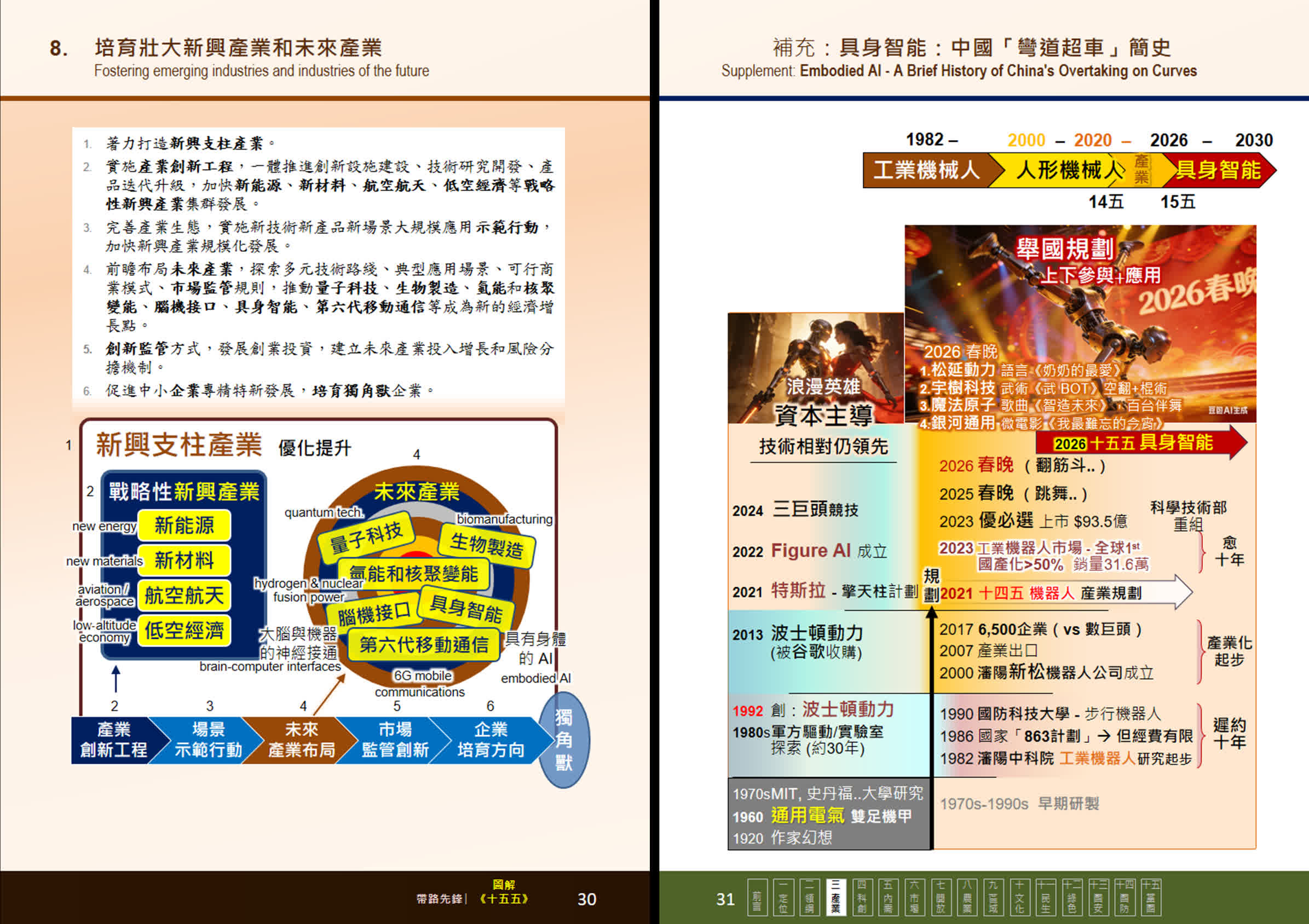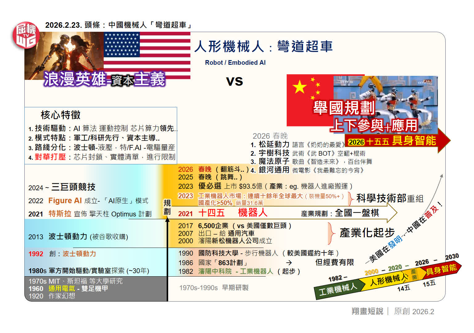 反觀中國,1986年「863 計劃」已將機械人列入國家戰略。其後走上全民務實、長期布局、穩步推進的道路,二十多年前「新松機械人」成立,拉開產業化序幕;十多年前中國機械人開始出口全球;近年在國家規劃推動下全面加速。2024年自主品牌工業機械人國內市場佔有率突破 50%,自2013年起連續十餘年銷量佔全球首位;今年春晚多家企業齊登場,標誌人形機械人進入重點發展階段。