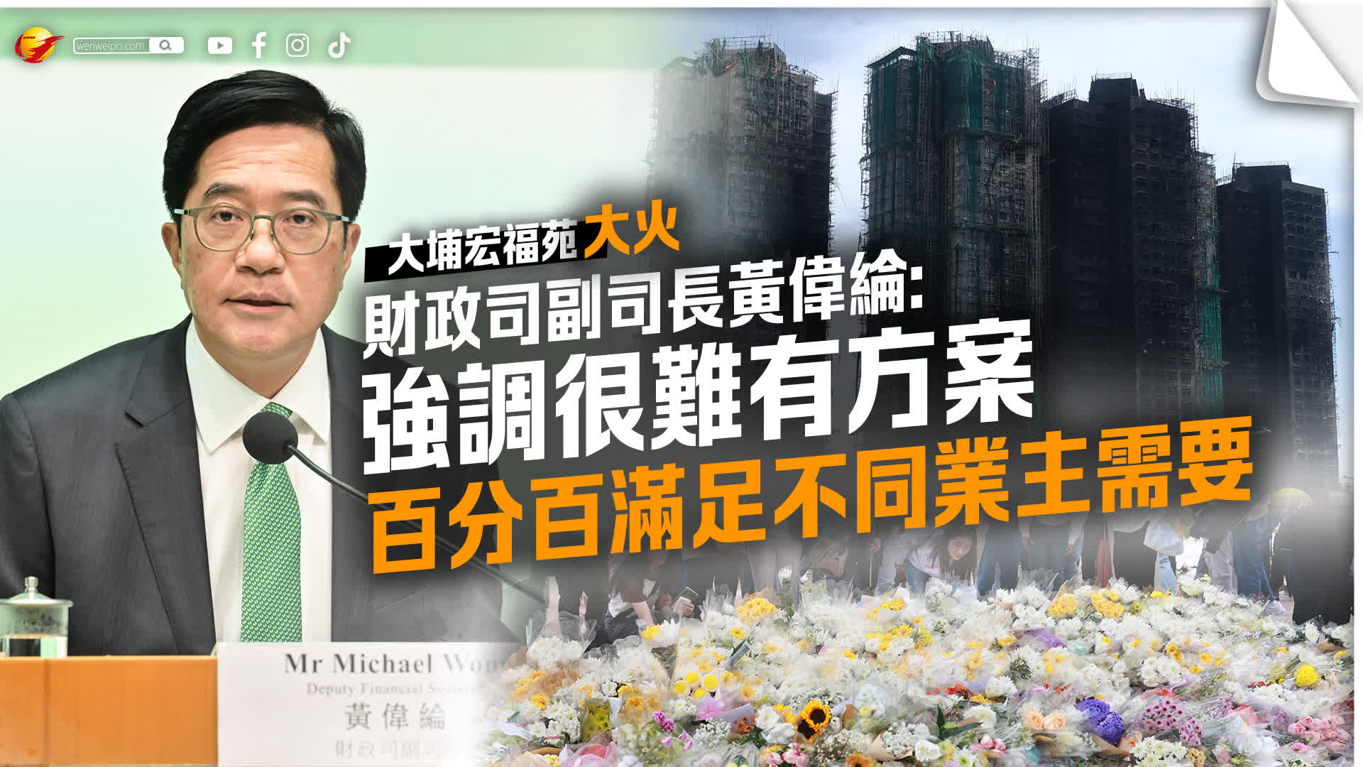 香港文匯報訊(記者 蕭景源)大埔宏福苑發生五級火警,導致數以千計受影響居民痛失家園。政府前日(21日)公布宏福苑長遠安置方案,以8,000或10,500元呎價收購宏福苑業權;但早前問卷調查中,12%居民表明不接受收購。財政司副司長黃偉綸今日(23日)在電台節目中表示,未來數日「一戶一社工」將會接觸宏福苑居民,經同意後「解說專隊」便會直接聯繫業主,向他們解釋各個長遠居住方案細節,強調很難有一個方案是百分百滿足到不同業主需要,但確信目前提出的方案有相當吸引力,也有很多選項。