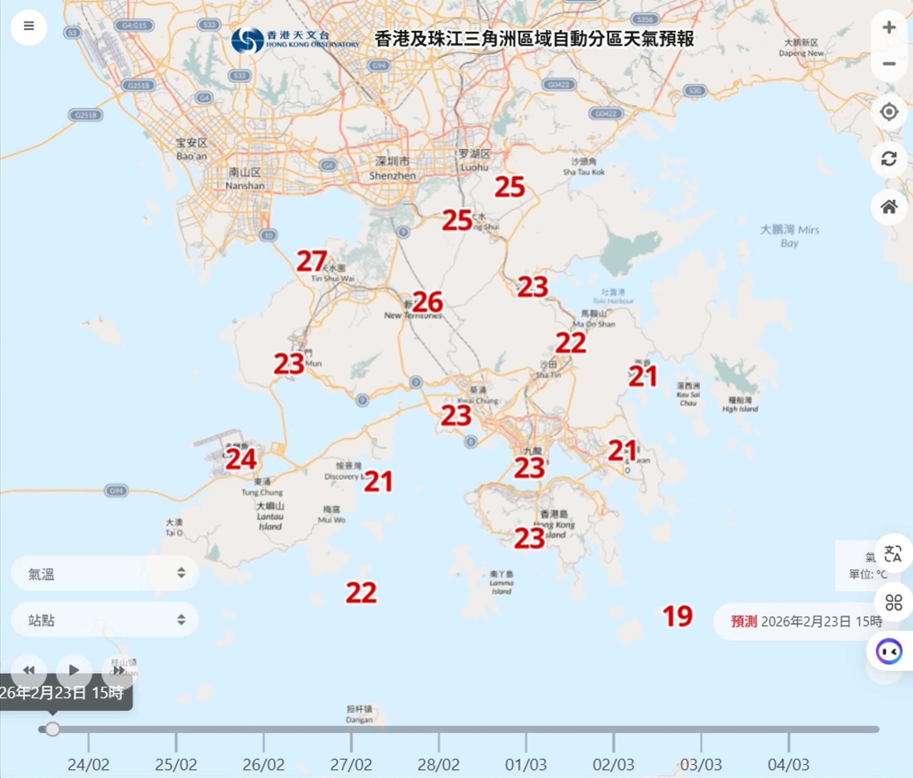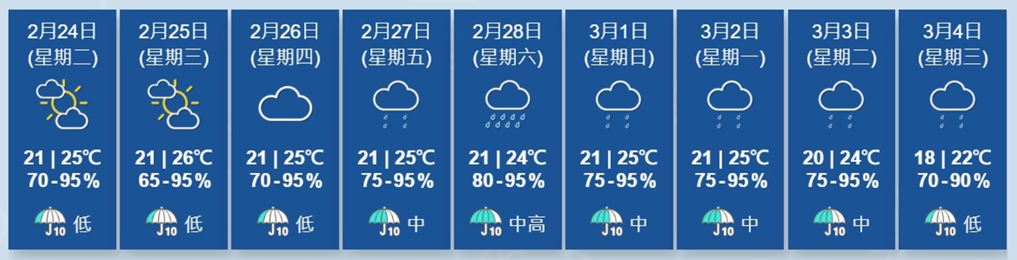 據天文台的九天天氣預測,明日(24日)起一連八日相對濕度高達95%,同時,明後兩日溫暖,周三(25日)市區氣溫高達26度,屯門、上水、流浮山等新界多區更升穿28度,而部分地區能見度較低。