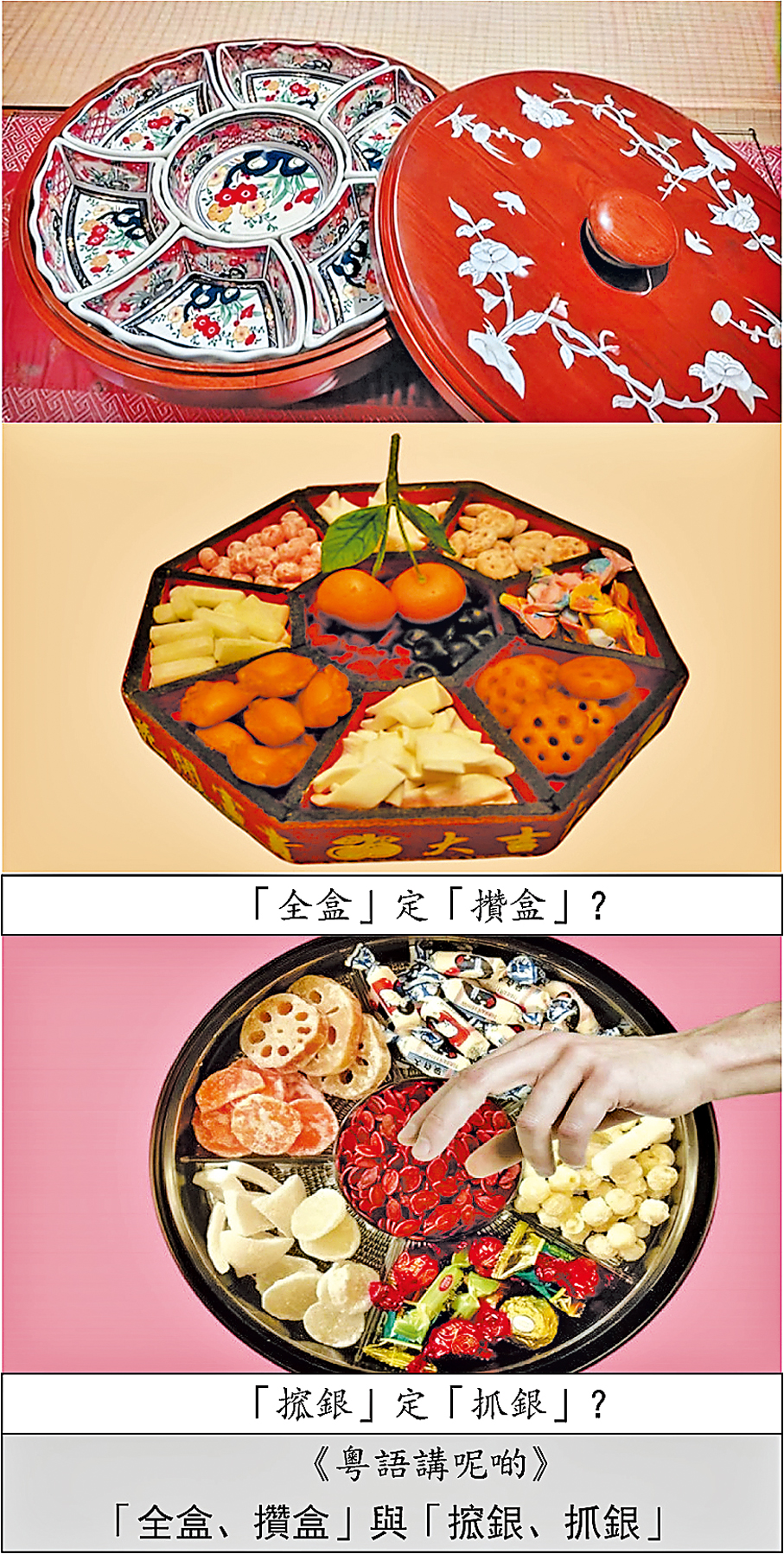中國人過年,家中必定會準備一個現代人以為是「零食盒」的「全盒」。此類盒多為圓形或多角形(以六、八角最為普遍),當中分開多格(以七、九格最為普遍);盛着一些糖果、炸物和瓜子,而瓜子一般放在中央的圓格內。