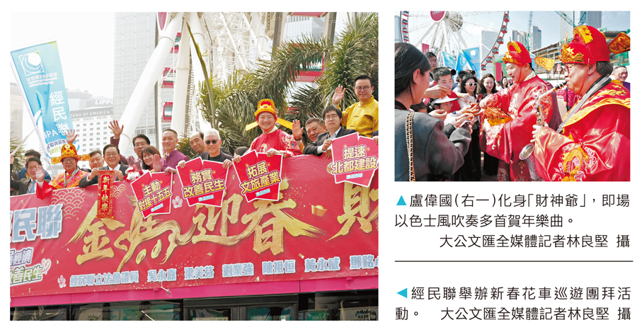 香港文匯報訊 經民聯昨日舉辦新春花車巡遊團拜活動。經民聯監事會主席林建岳、主席盧偉國、黨魁吳永嘉等,以及多位立法會議員、區議員、青委會和地區事委會的成員一同乘坐新春開運花車,穿梭港九多區,向市民及旅客拜年,祝願香港在新的一年開運昌隆,馬到成功,經濟繁榮興旺。財政司司長陳茂波明天(25日)發表新一份財政預算案,經民聯希望政府大力提振股市、債市,鞏固本港金融中心地位及發展盛事經濟,以退稅、退差餉等方式紓緩中產壓力。