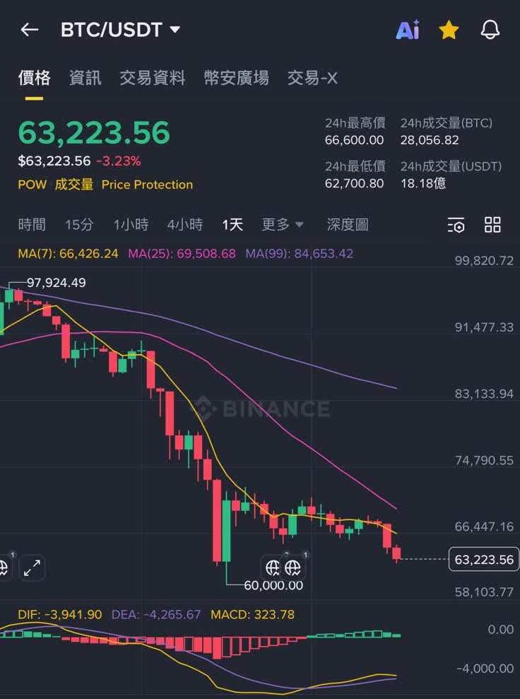 香港文匯報訊(記者 陳鍵行)在全球關稅緊張以及地緣政治衝突不斷的影響下,比特幣今日延續跌勢,一度跌穿63,000美元關卡,現反彈至63,223美元,日內跌幅逾4%。市場避險情緒升溫,資金從風險較高的資產撤出,成主要下跌因素。