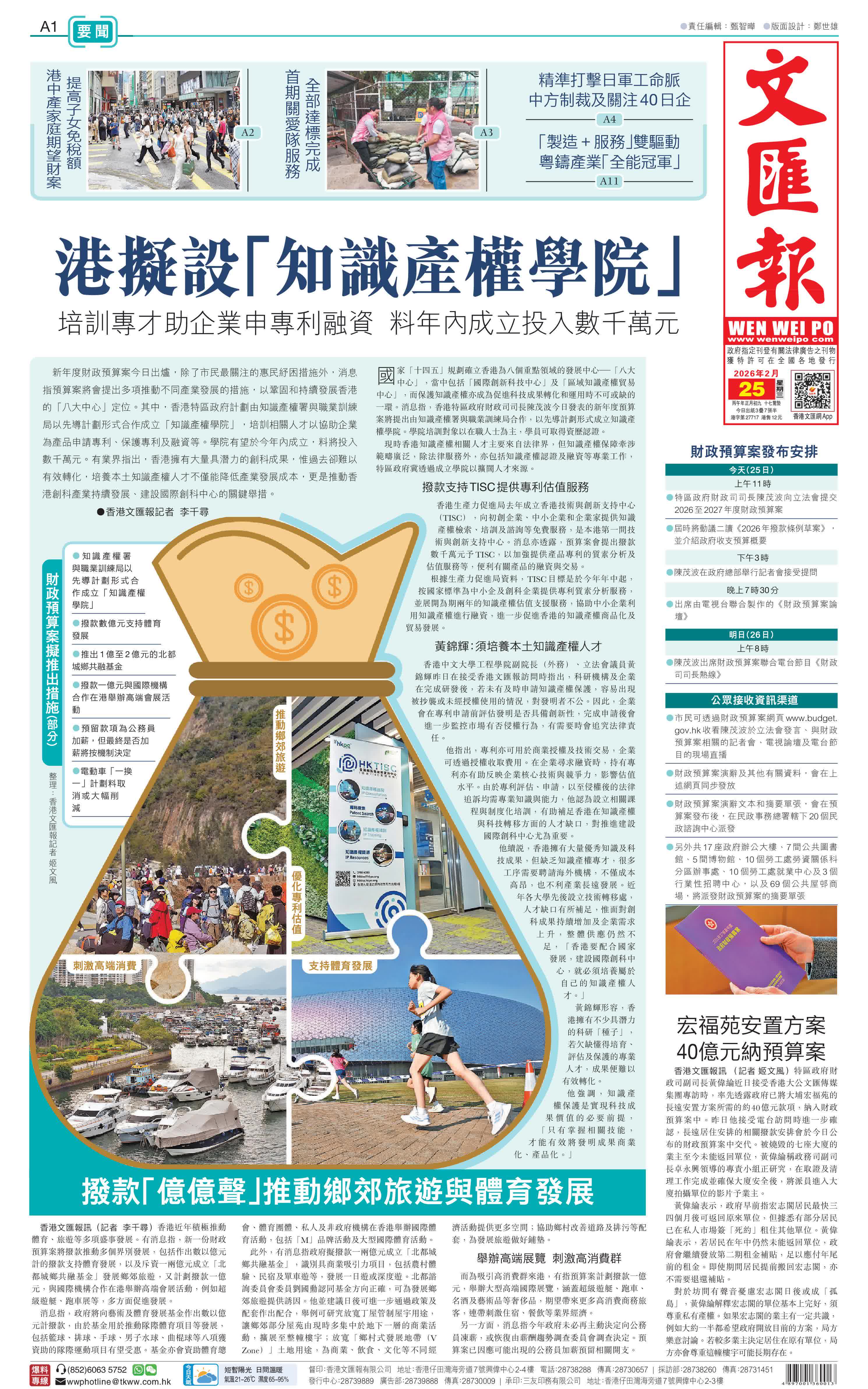 (香港文匯報記者 李千尋)新年度財政預算案今日出爐,除了市民最關注的惠民紓困措施外,消息指預算案將會提出多項推動不同產業發展的措施,以鞏固和持續發展香港的「八大中心」定位。其中,香港特區政府計劃由知識產權署與職業訓練局以先導計劃形式合作成立「知識產權學院」,培訓相關人才以協助企業為產品申請專利、保護專利及融資等。學院有望於今年內成立,料將投入數千萬元。有業界指出,香港擁有大量具潛力的創科成果,惟過去卻難以有效轉化,培養本土知識產權人才不僅能降低產業發展成本,更是推動香港創科產業持續發展、建設國際創科中心的關鍵舉措。