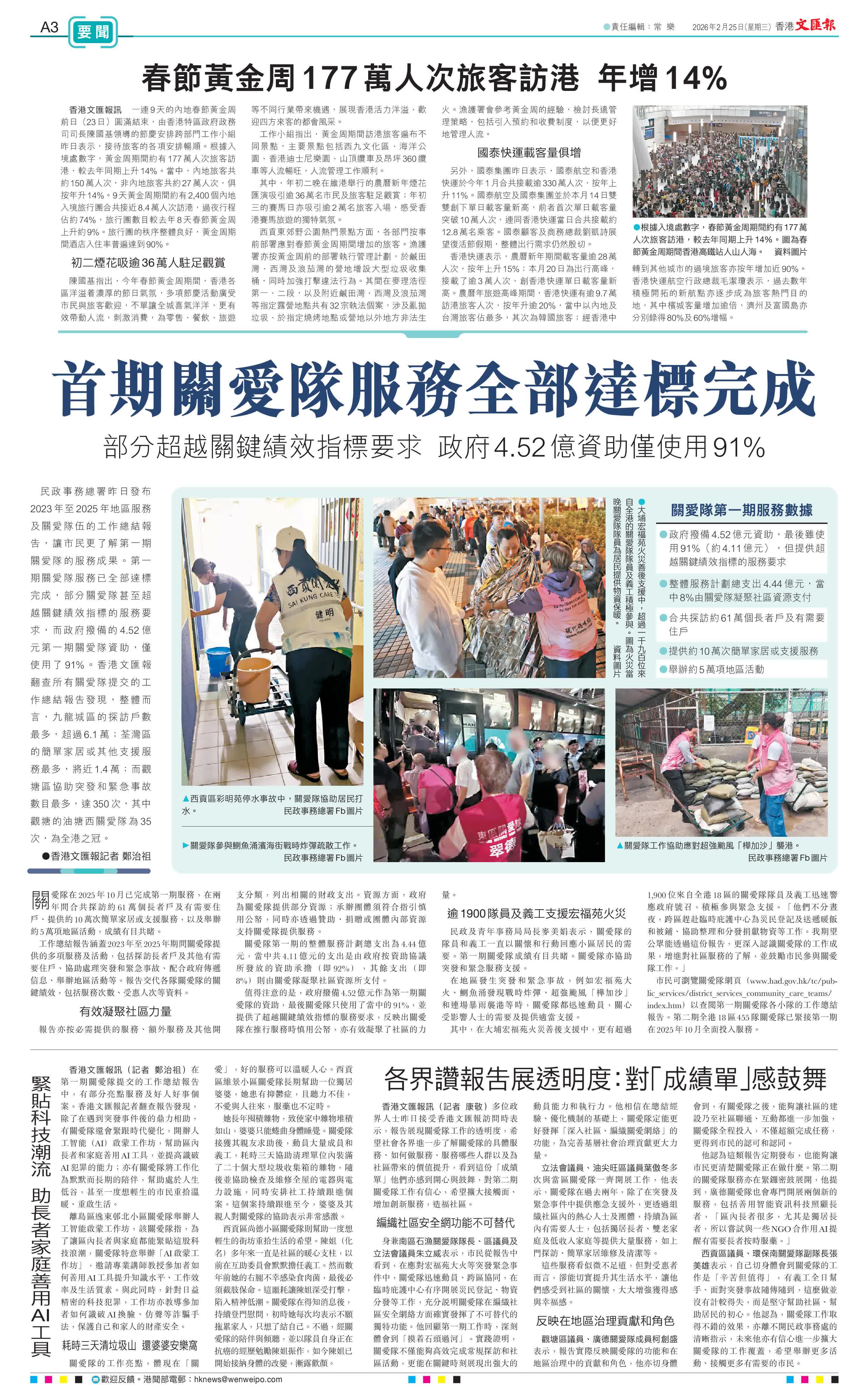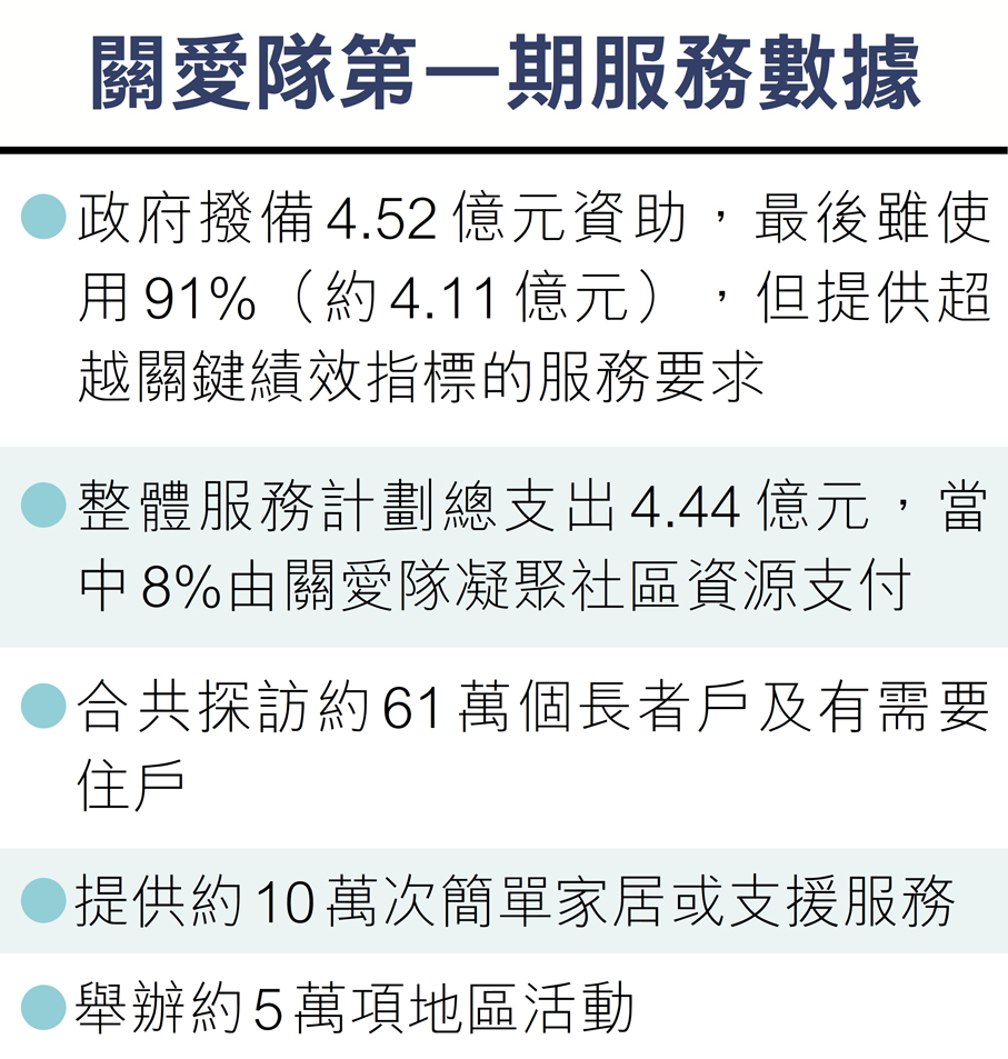 關愛隊在2025年10月已完成第一期服務,在兩年間合共探訪約61萬個長者戶及有需要住戶、提供約10萬次簡單家居或支援服務,以及舉辦約5萬項地區活動,成績有目共睹。