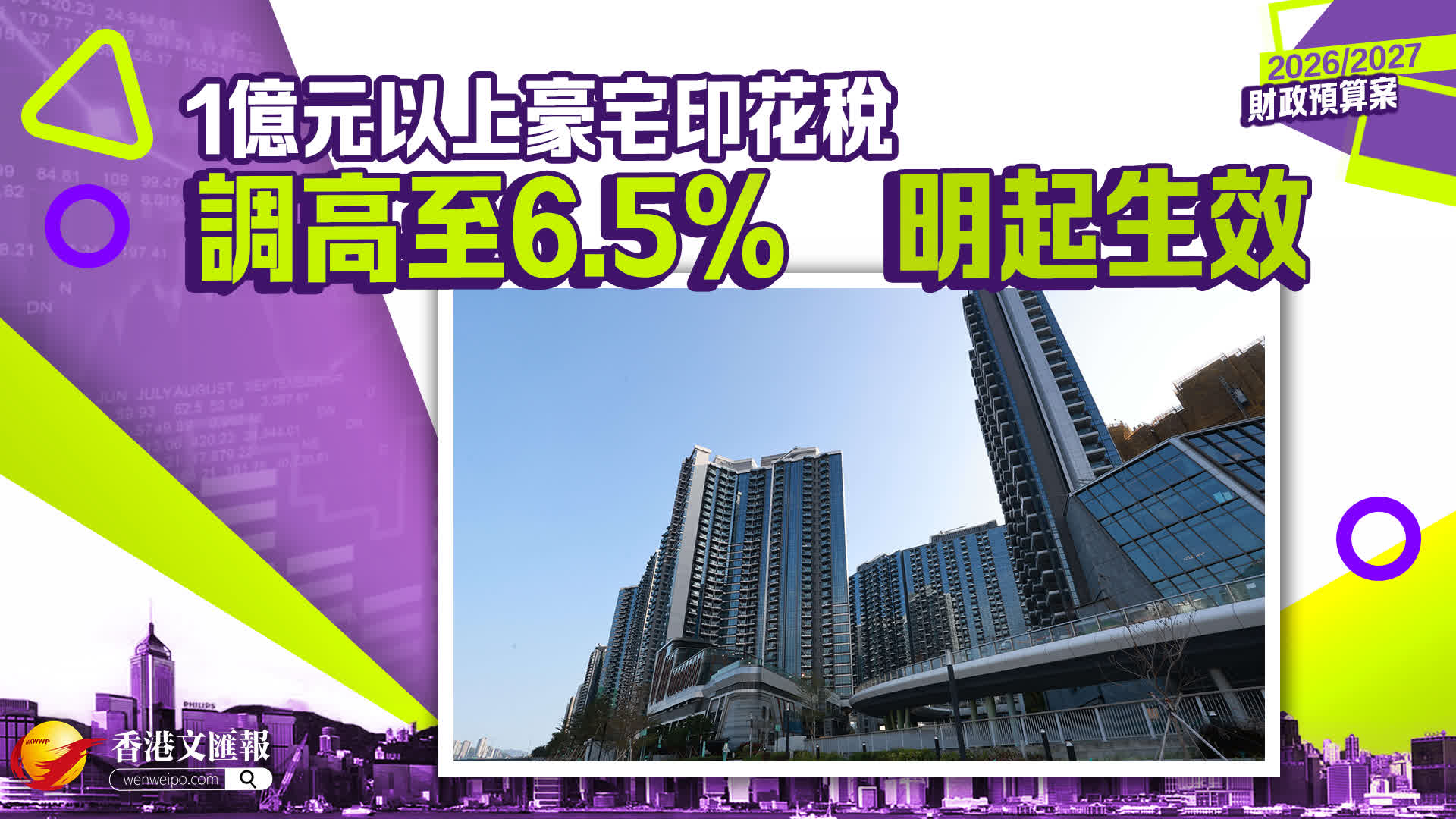 財政司司長陳茂波今早(25日)到立法會發表新一份財政預算案。陳茂波表示,在開源方面,秉持「能者多付」的原則,1億元以上的住宅物業交易印花稅稅率,將由4.25%調高至6.5%,影響約0.3%的住宅物業交易,估計每年可增加約10億元收入。措施將於條例修訂草案獲通過後,追溯至明日(26日)開始生效。