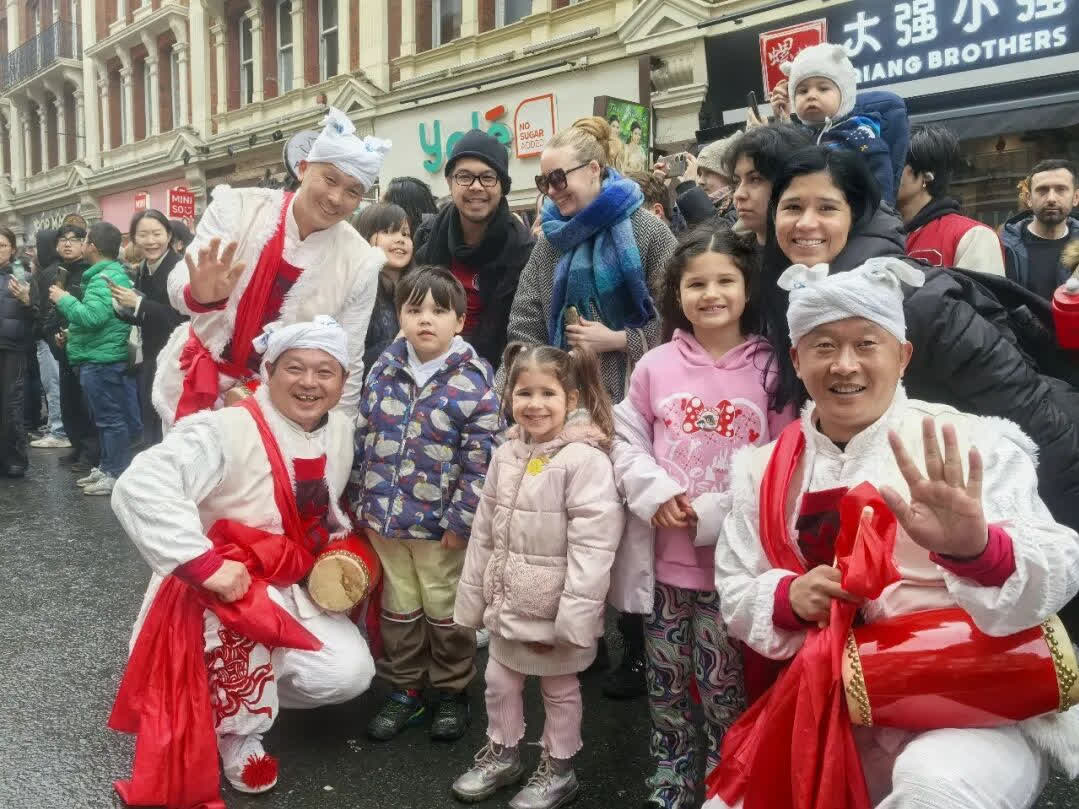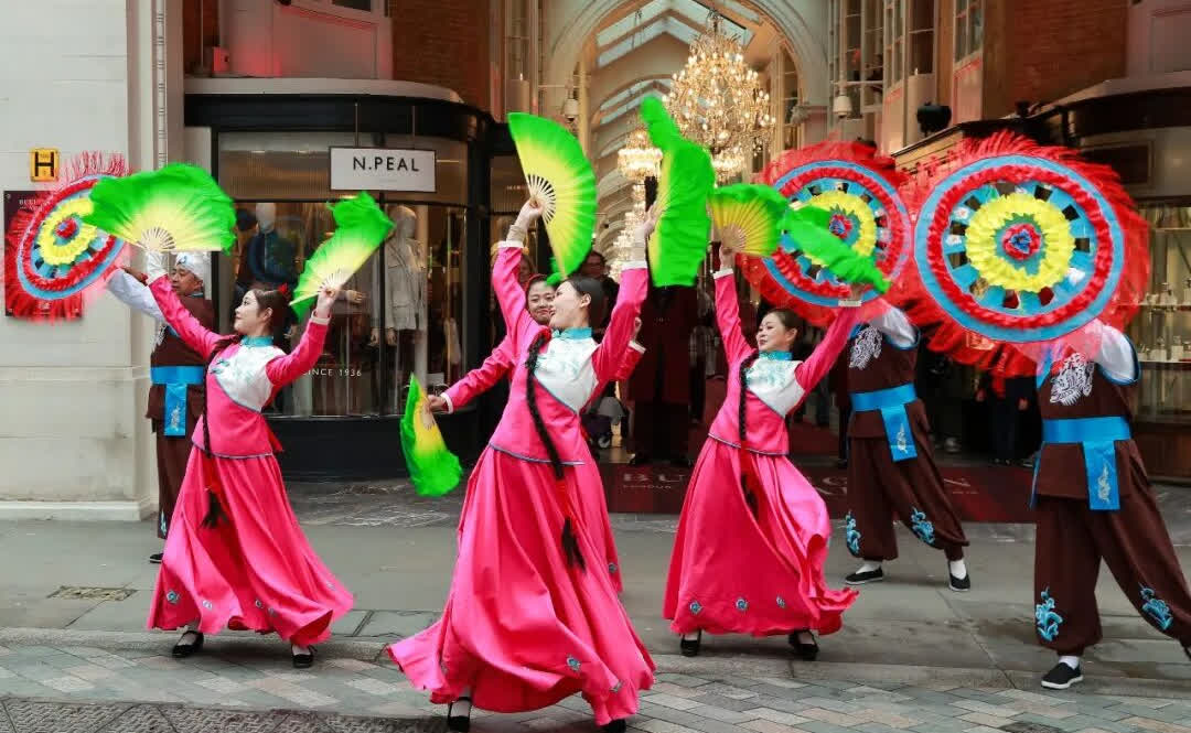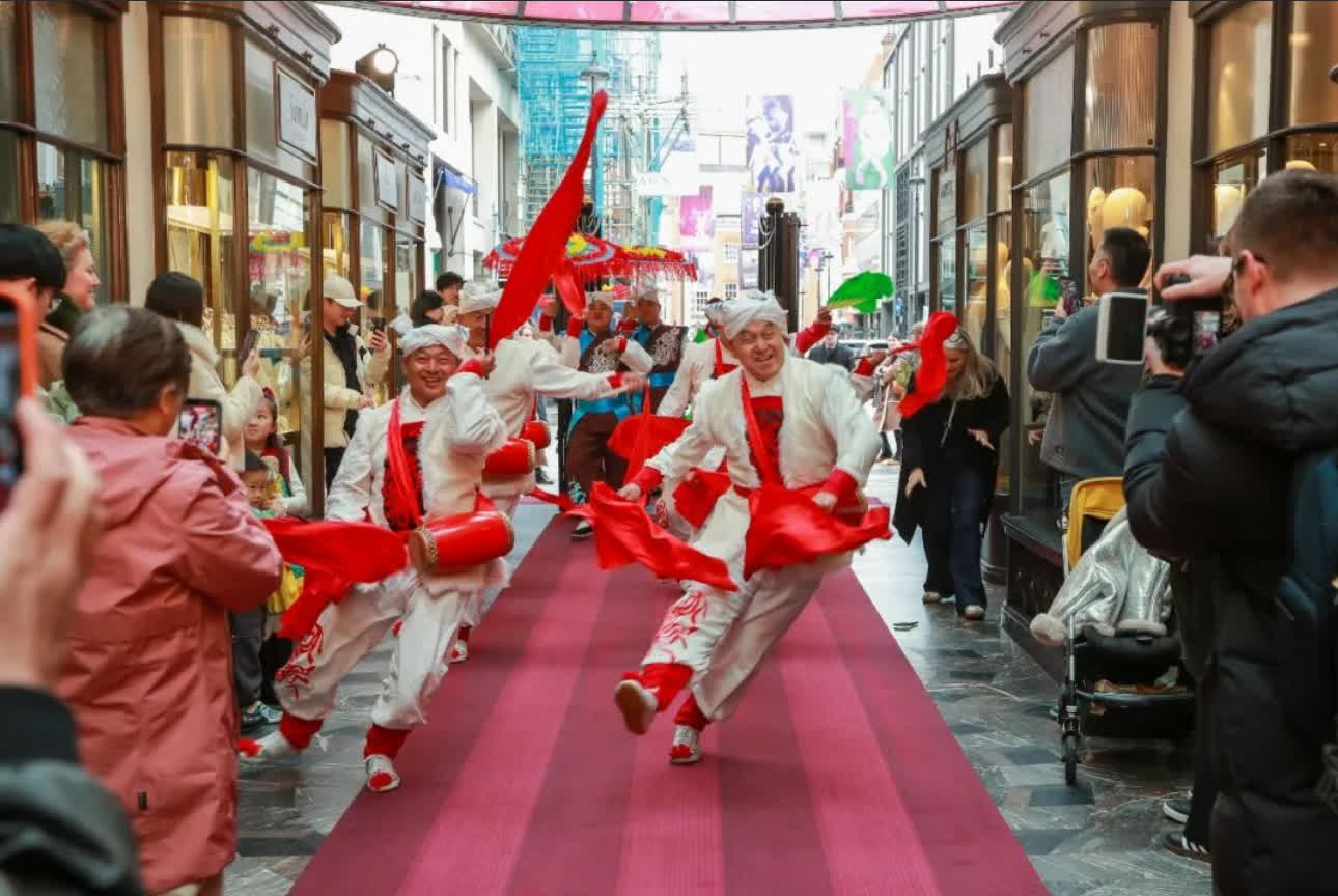 在英期間,陝西腰鼓秧歌團還前往倫敦著名的文化地標——伯靈頓拱廊進行演出,來自東方的特色非遺與西方的古典建築相映成趣,被現場許多觀眾用手機記錄了下來,成為了關於「中國年」的美好記憶。