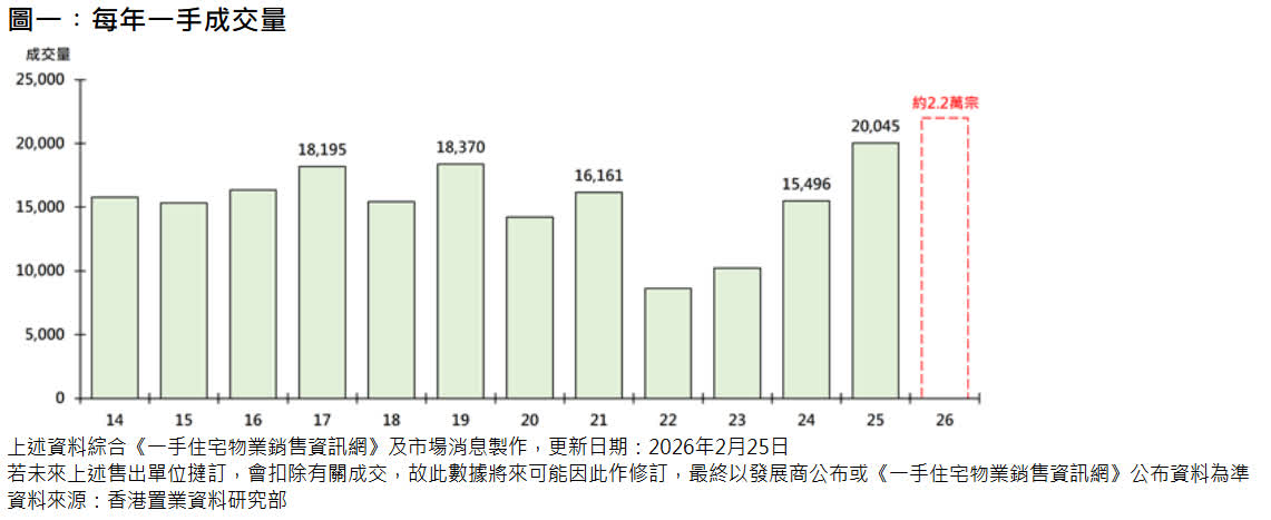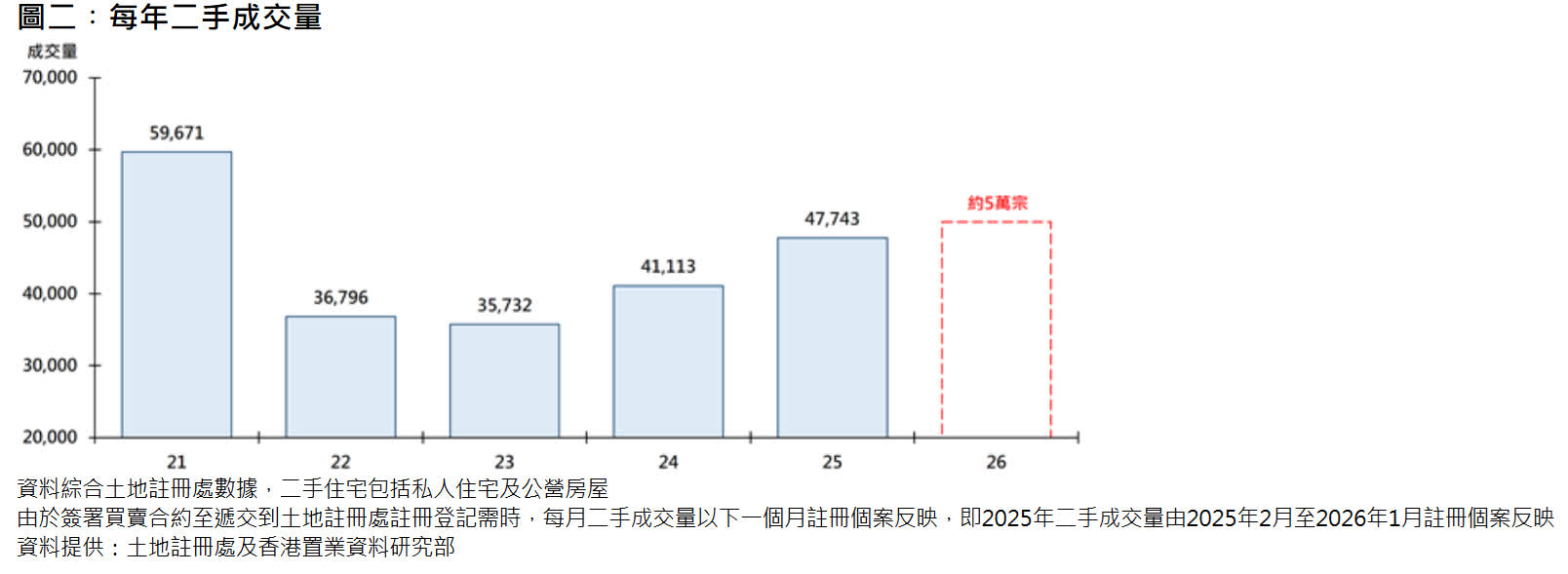 展望今年,料一手成交量達2.2萬宗,屆時將創自2013年《一手住宅物業銷售條例》實施後新高,並首次連續2年超越2萬宗(見圖一);二手成交量則升至約5萬宗,創5年新高(見圖二)。在今年經濟持續改善的情況下,預計樓市可延續「價量齊升」趨勢,樓價有望升約10%至15%。