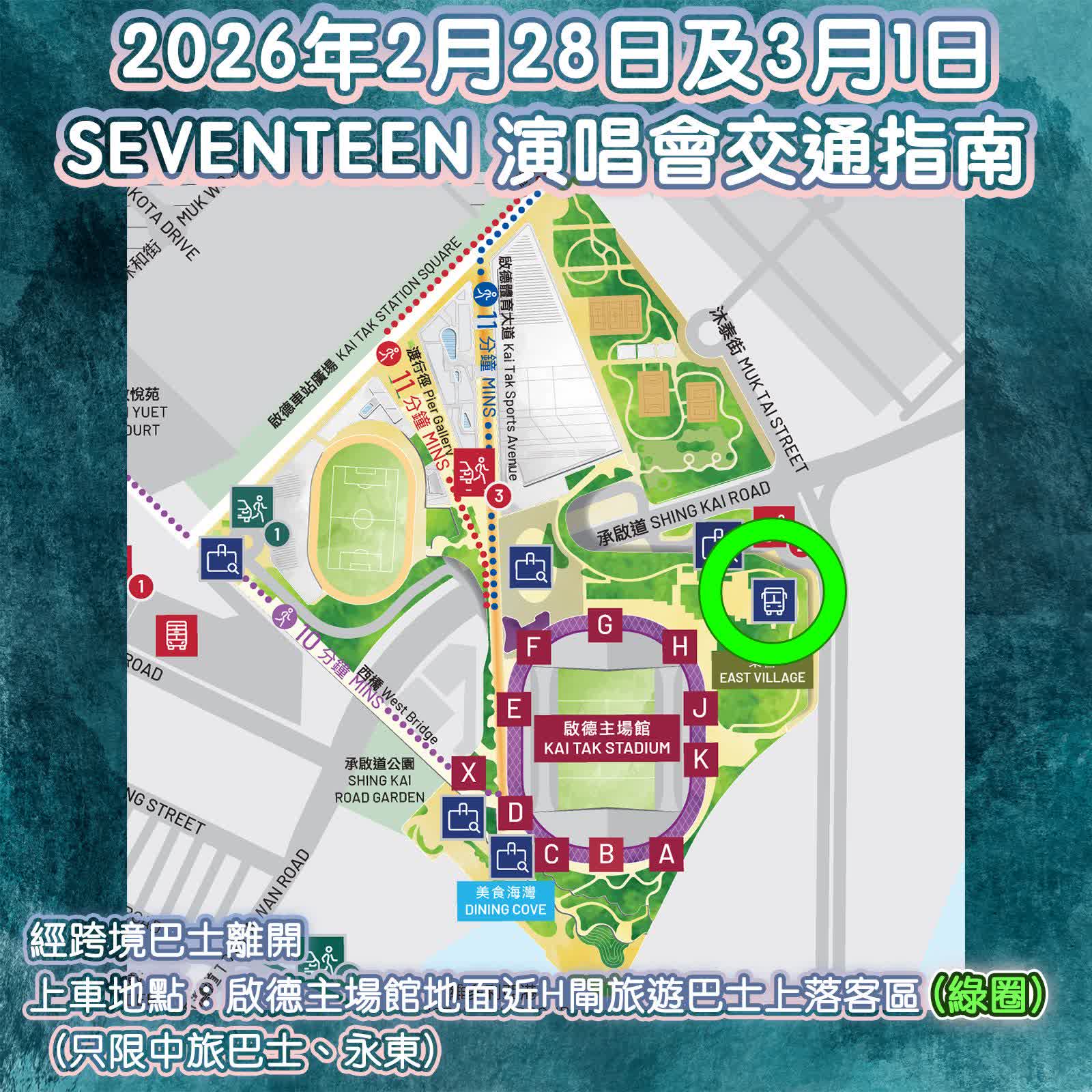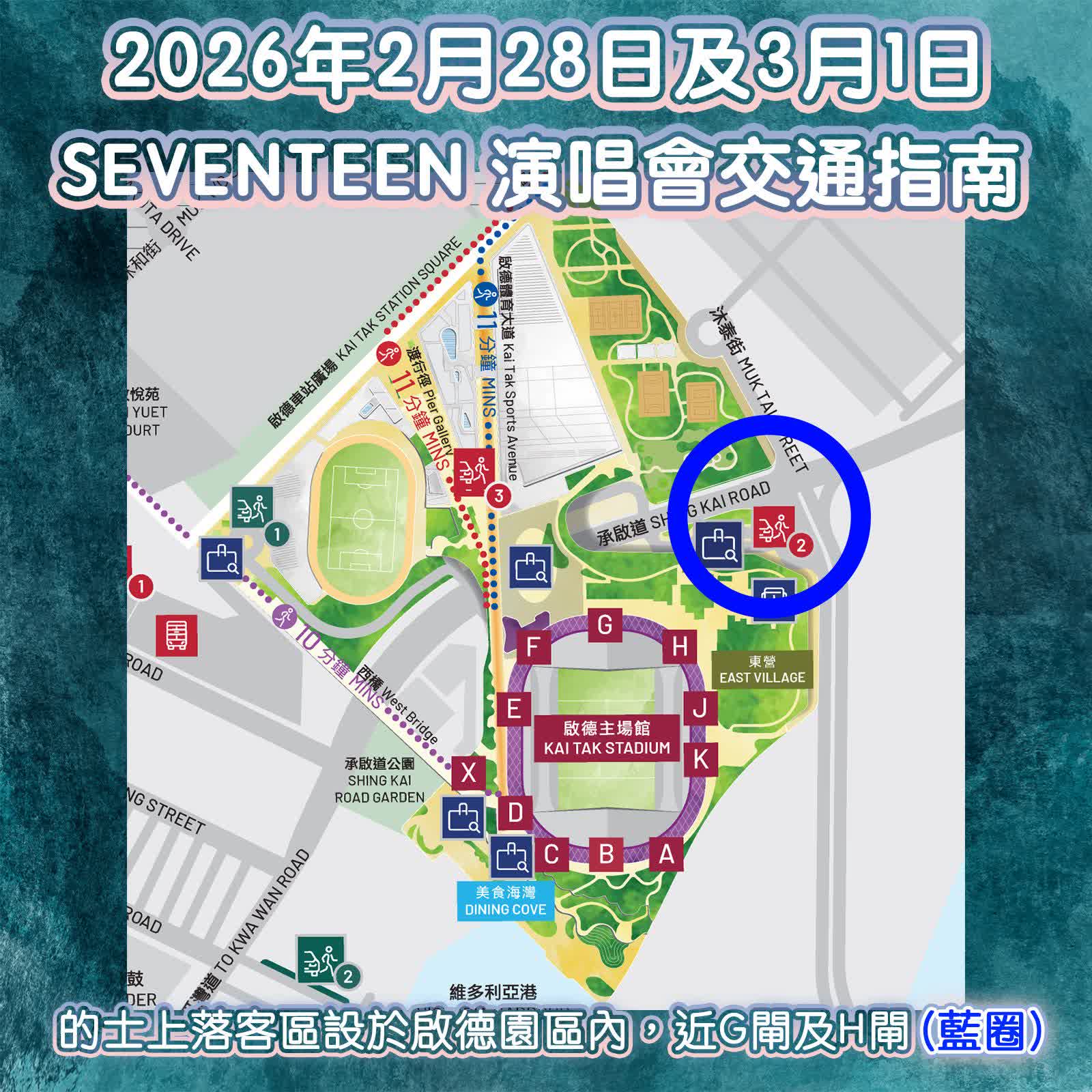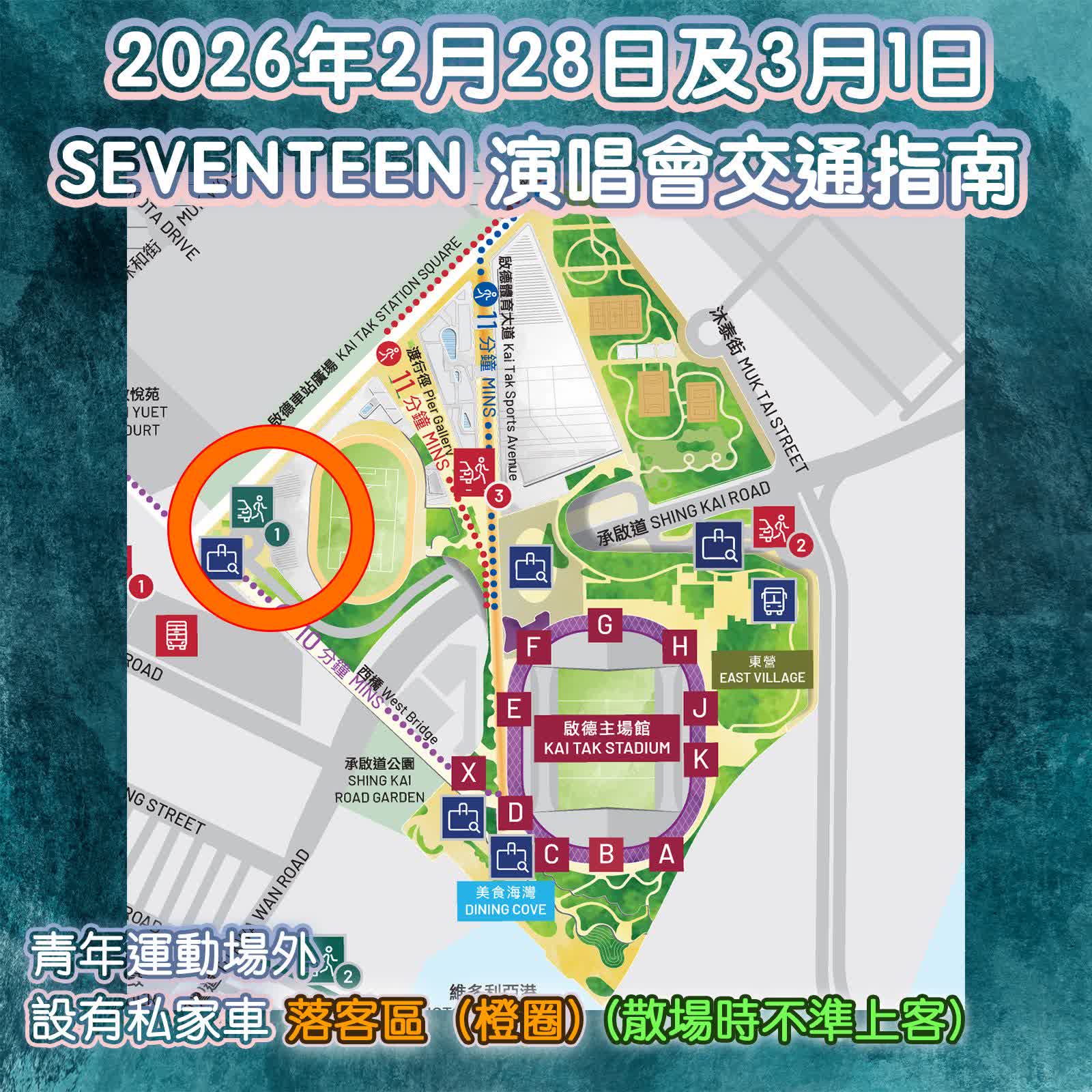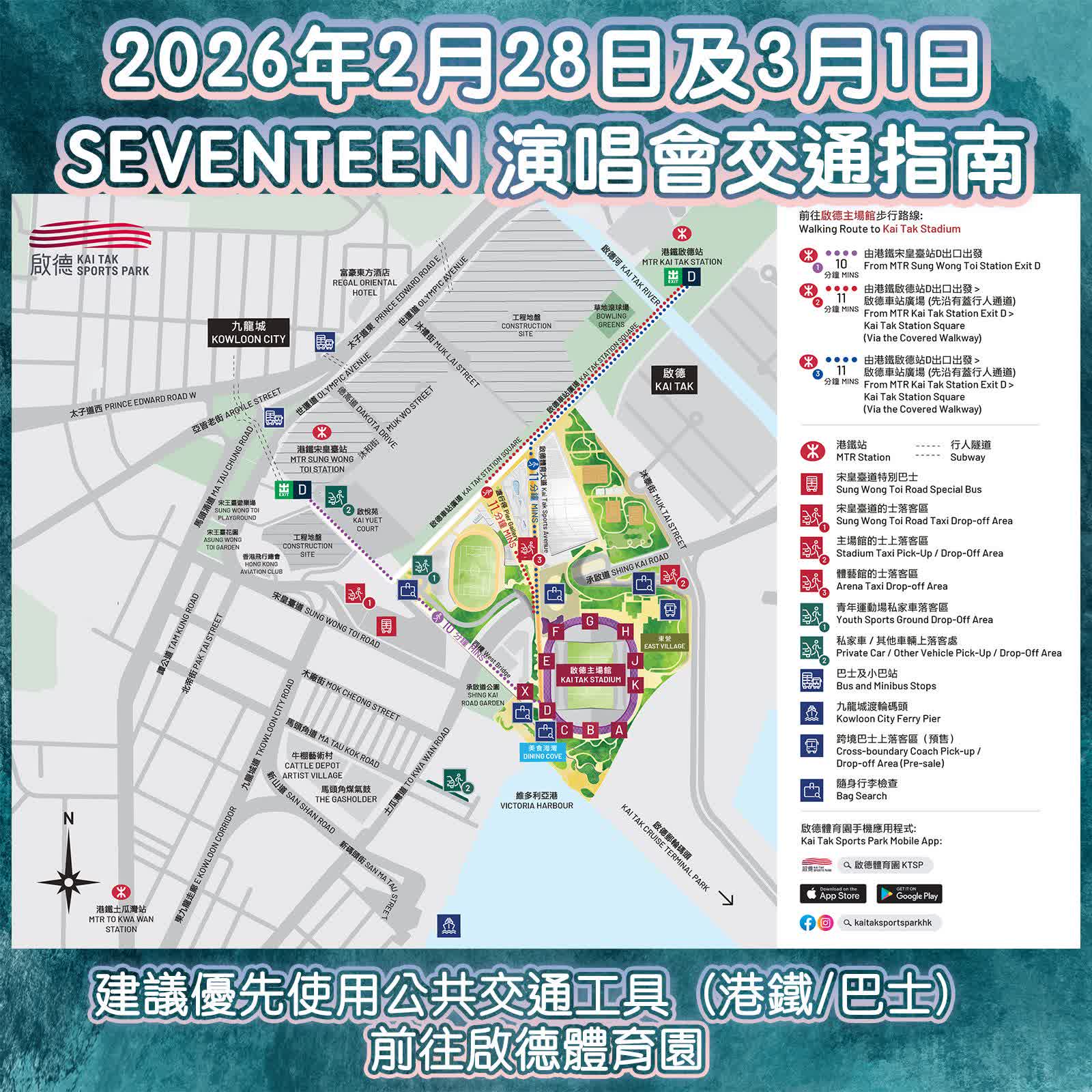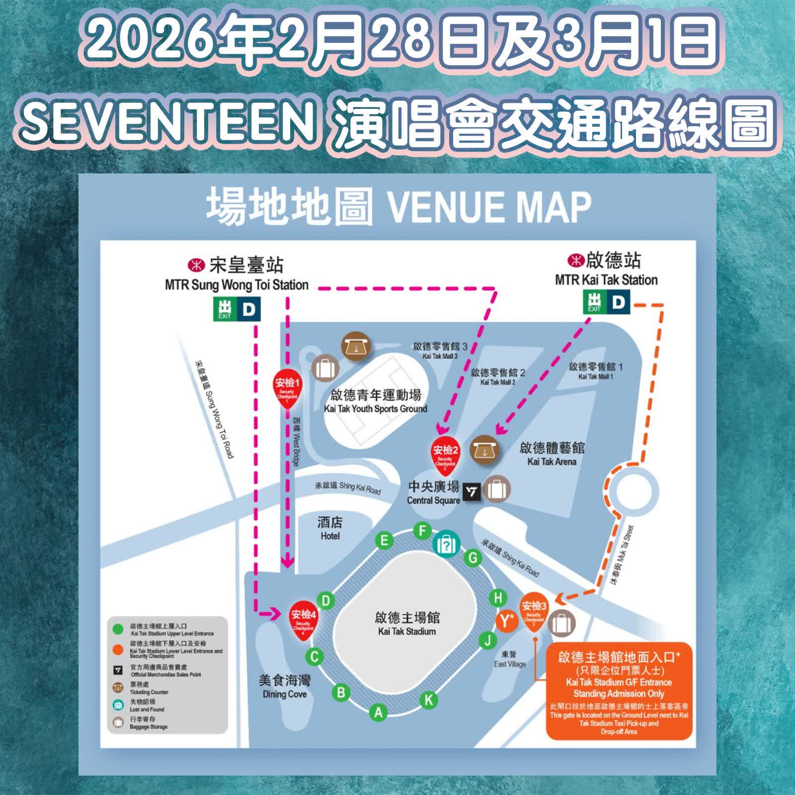 香港文匯報訊(記者 蕭景源)韓國超人氣組合SEVENTEEN將於周末2月28日及3月1日周日,在啟德主場館舉行演唱會 — SEVENTEEN WORLD TOUR [NEW_] IN HONG KONG,上述兩晚另有「LCK Cup Finals 2026」在啟德體藝館內上演。為確保活動順利進行,警方今日(25日)呼籲觀眾注意以下入場及散場安排: