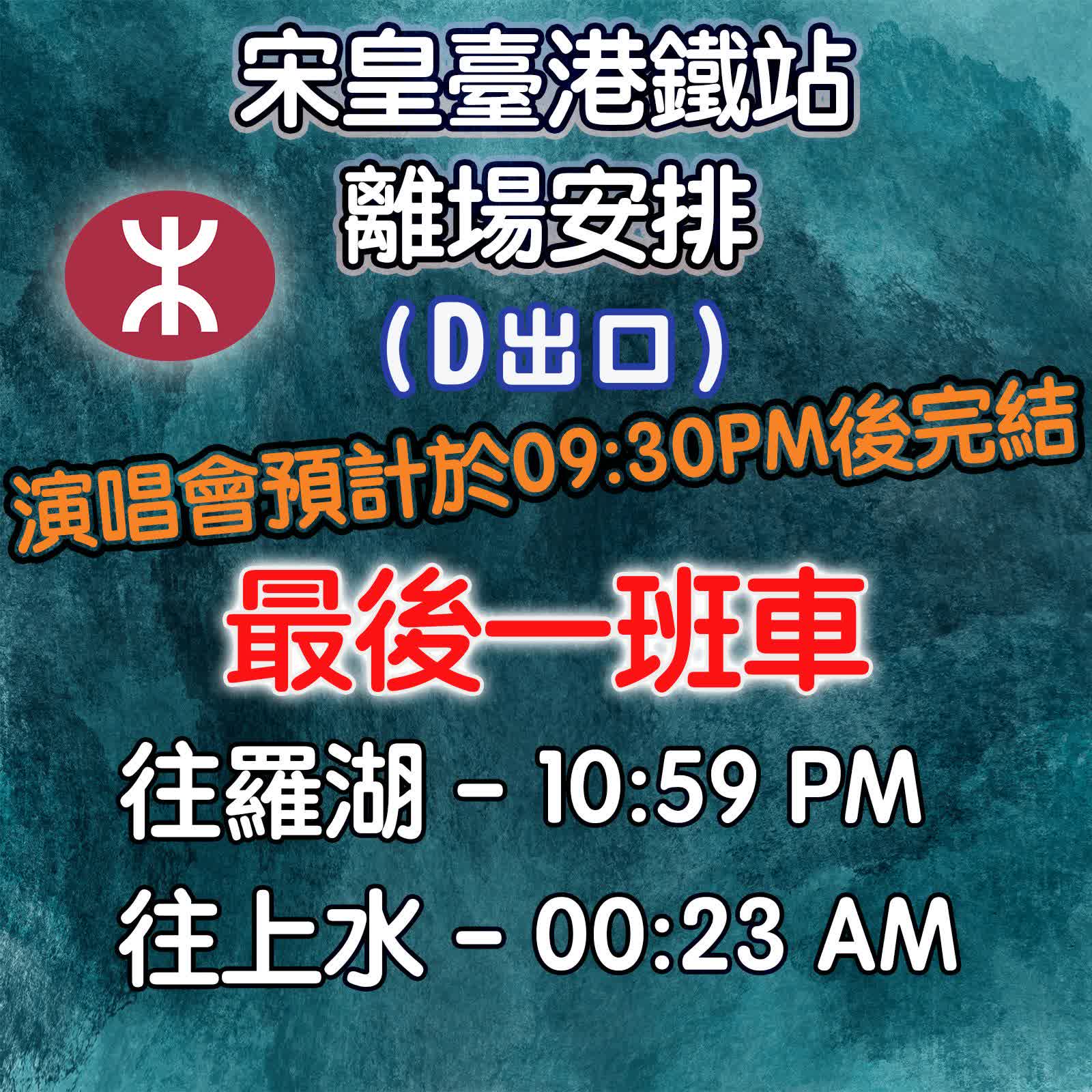 由於演出在06:00PM開始,預計09:30PM後結束。觀眾可選擇在港鐵宋皇臺站或啟德站搭乘往羅湖方向的列車外,亦可選乘港鐵往上水方向,或搭乘巴士路線SP12前往新田。