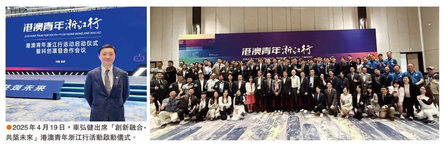 車弘健介紹2025年4月在浙江杭州未來科技城學術交流中心舉辦的「創新融合·共築未來」港澳青年浙江行活動。香港浙江省同鄉會聯合會聯手香港大學、香港中文大學、香港科技大學、香港理工大學和香港城市大學,組織150多名香港青年攜帶80多個科創項目考察交流,通過現場推介、項目路演、結對合作等方式,讓港澳青年科創人才與浙江省科創平台、產業平台、龍頭企業、投資機構等深度對接。他表示,該活動助力港澳高校的優秀科研成果轉化為新質生產力,促進浙港澳創新聯合體建設和「兩創」深度融合,團結引領港澳高層次青年人才在融入國家發展中成長成才、施展抱負、挺膺擔當。他期望通過這些務實舉措,讓浙港青年在融合發展中迸發出新的活力。