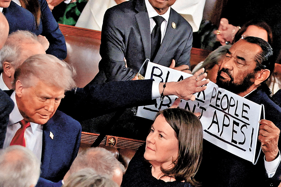 香港文匯報訊 特朗普的國情咨文演說遭到大批民主黨籍國會議員抵制,美媒統計,約30名民主黨議員缺席演說以示抗議。非裔民主黨籍眾議員格林還在演說期間,舉起寫有「非裔不是猿猴」的標語,抗議特朗普早前在自家社媒發布影片、涉嫌歧視非裔前總統奧巴馬及其夫人米歇爾,格林隨後被請出會議場。