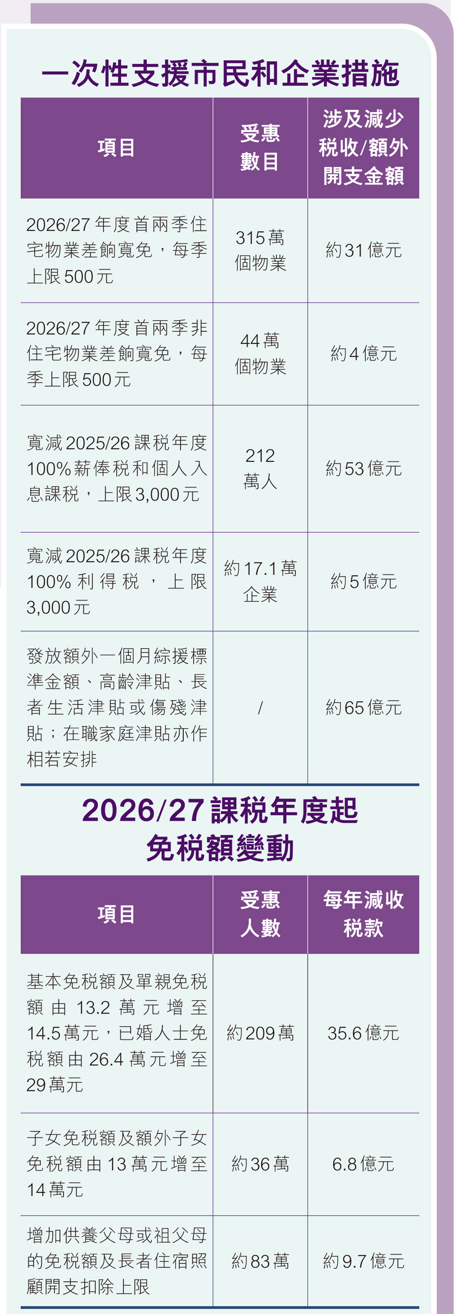 預算案建議的一次性支援市民和企業措施,包括寬減2026/27年度首兩季住宅及非住宅物業差餉,每季上限500元;寬減2025/26課稅年度100%薪俸稅和個人入息課稅,上限3,000元;寬減2025/26課稅年度100%利得稅,上限3,000元;以及綜援等受助人「出雙糧」(見另稿),合共涉款158億元。