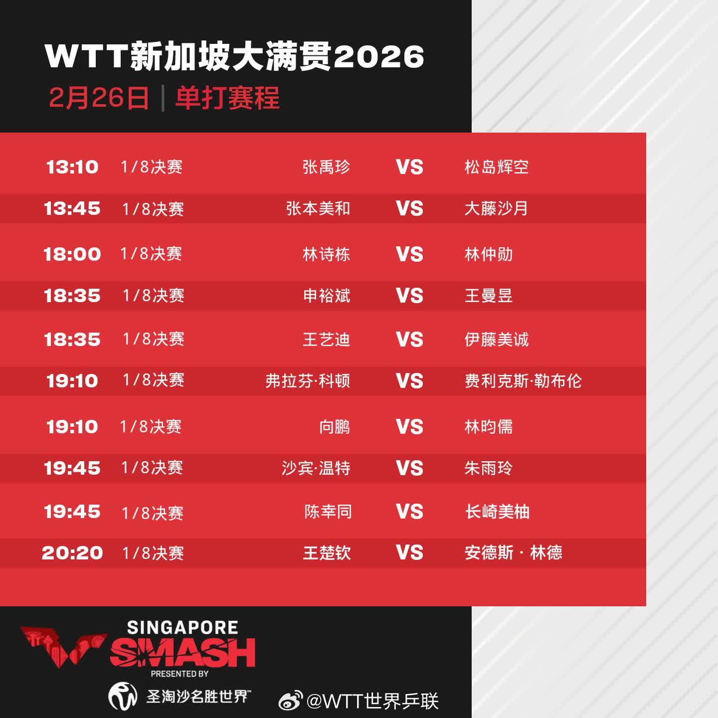 2026年WTT新加坡大滿貫精彩繼續,經過4個正賽日的爭奪,孫穎莎、王曼昱、王楚欽等11名國乒選手晉級單打16強。26日將進行男女單打1/8決賽及雙打半決賽,其中將上演3場「中日對決」,具體賽程如下: