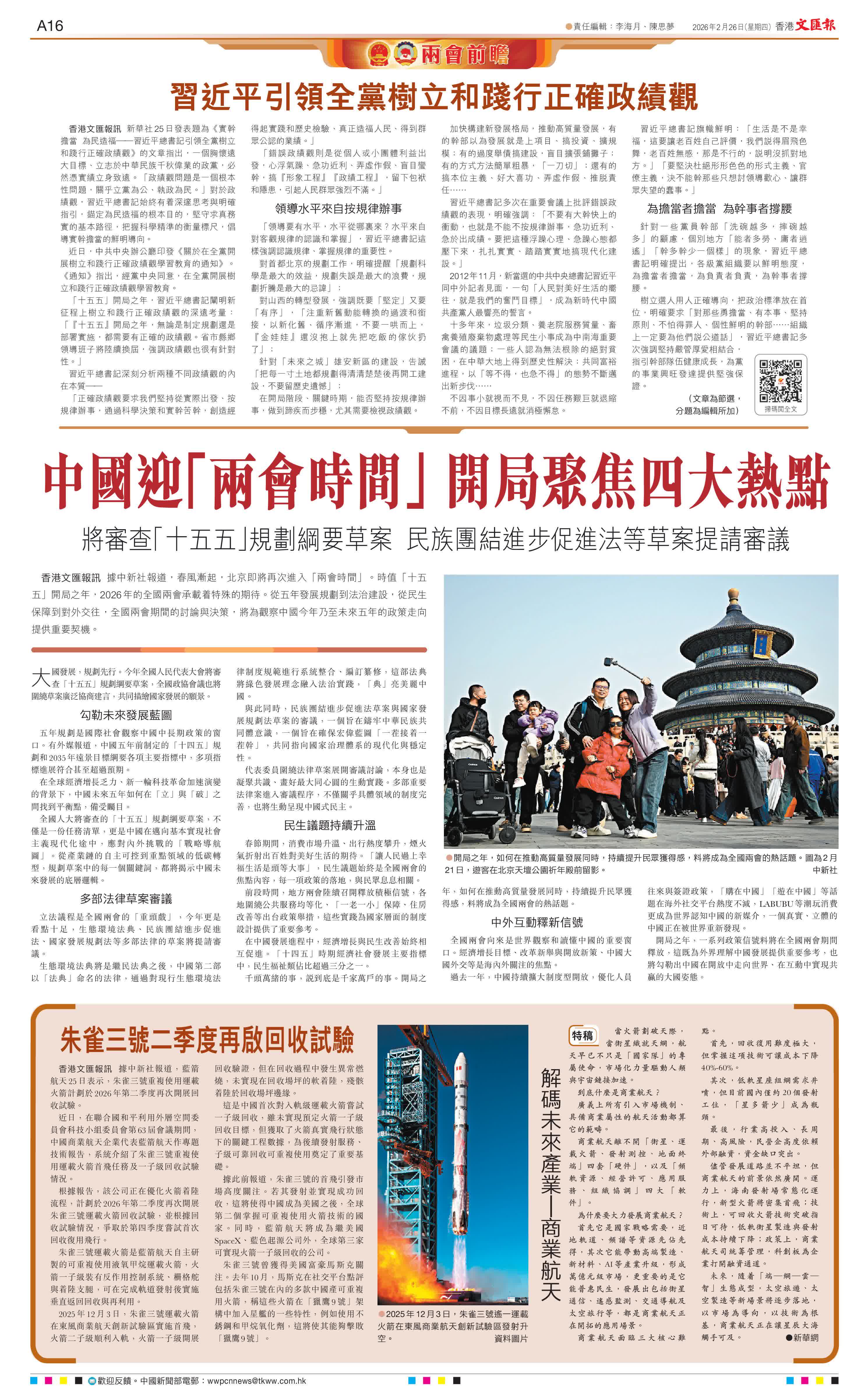 香港文匯報訊 據中新社報道,春風漸起,北京即將再次進入「兩會時間」。時值「十五五」開局之年,2026年的全國兩會承載着特殊的期待。從五年發展規劃到法治建設,從民生保障到對外交往,全國兩會期間的討論與決策,將為觀察中國今年乃至未來五年的政策走向提供重要契機。
