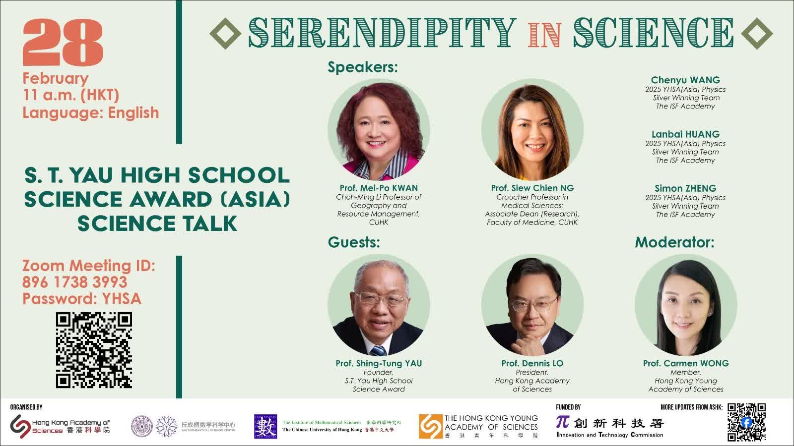 剛於今屆丘成桐中學科學獎(亞洲)獲得物理科銀獎的弘立書院隊伍成員王晨羽、黃藍白及鄭斯允將於講座上分享參賽經驗。香港青年科學院院士、香港大學李嘉誠醫學院助理院長(核心平台及拓展)黃澤蕾將擔任講座主持。