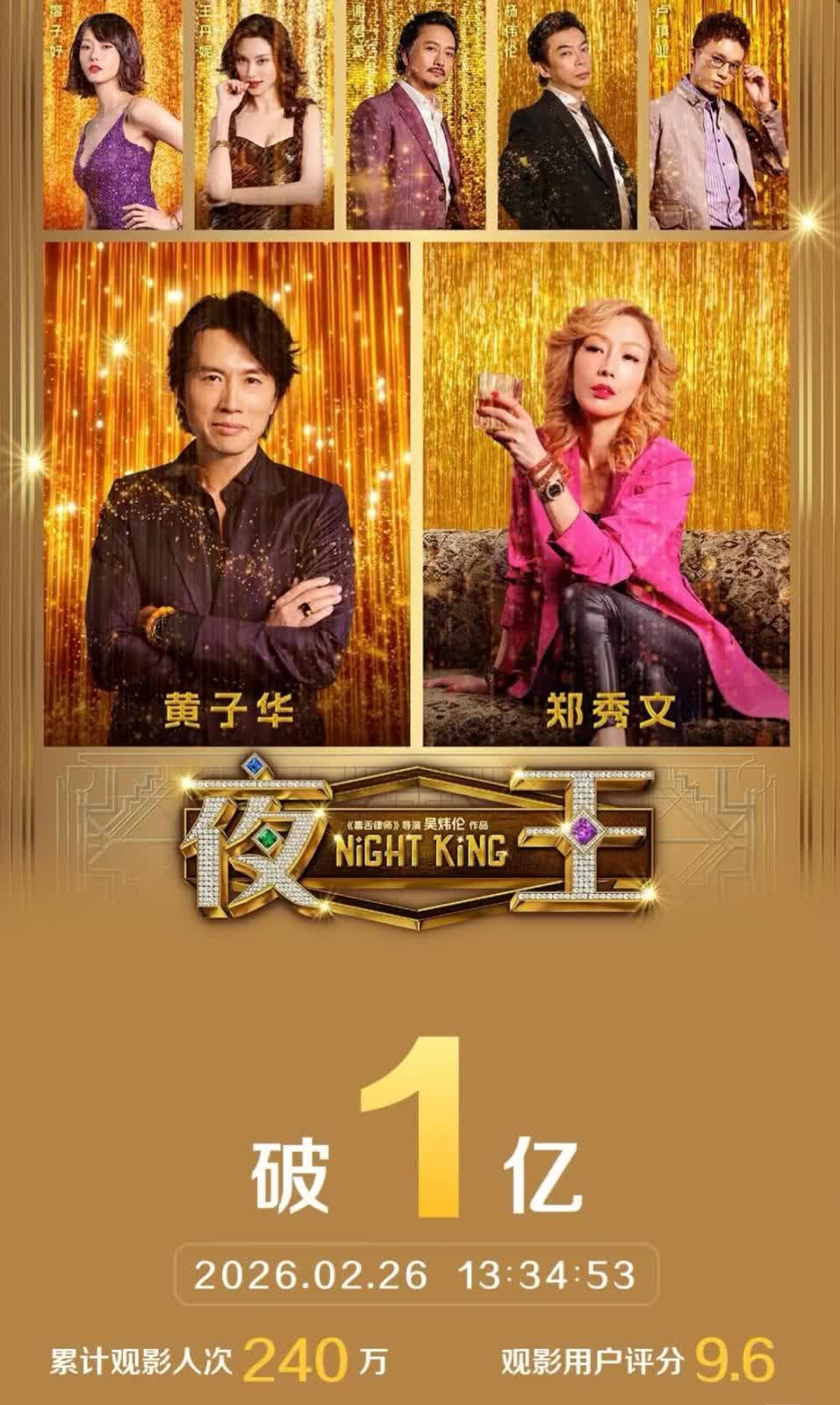 香港文匯報訊(記者 余雁)據貓眼專業版數據,黃子華、鄭秀文領銜主演的粵語喜劇電影《夜王》在內地上映的第7天,累計票房破1億元人民幣。另外,《夜王 》在豆瓣開分7.8分,成為今年春節檔最高分影片。