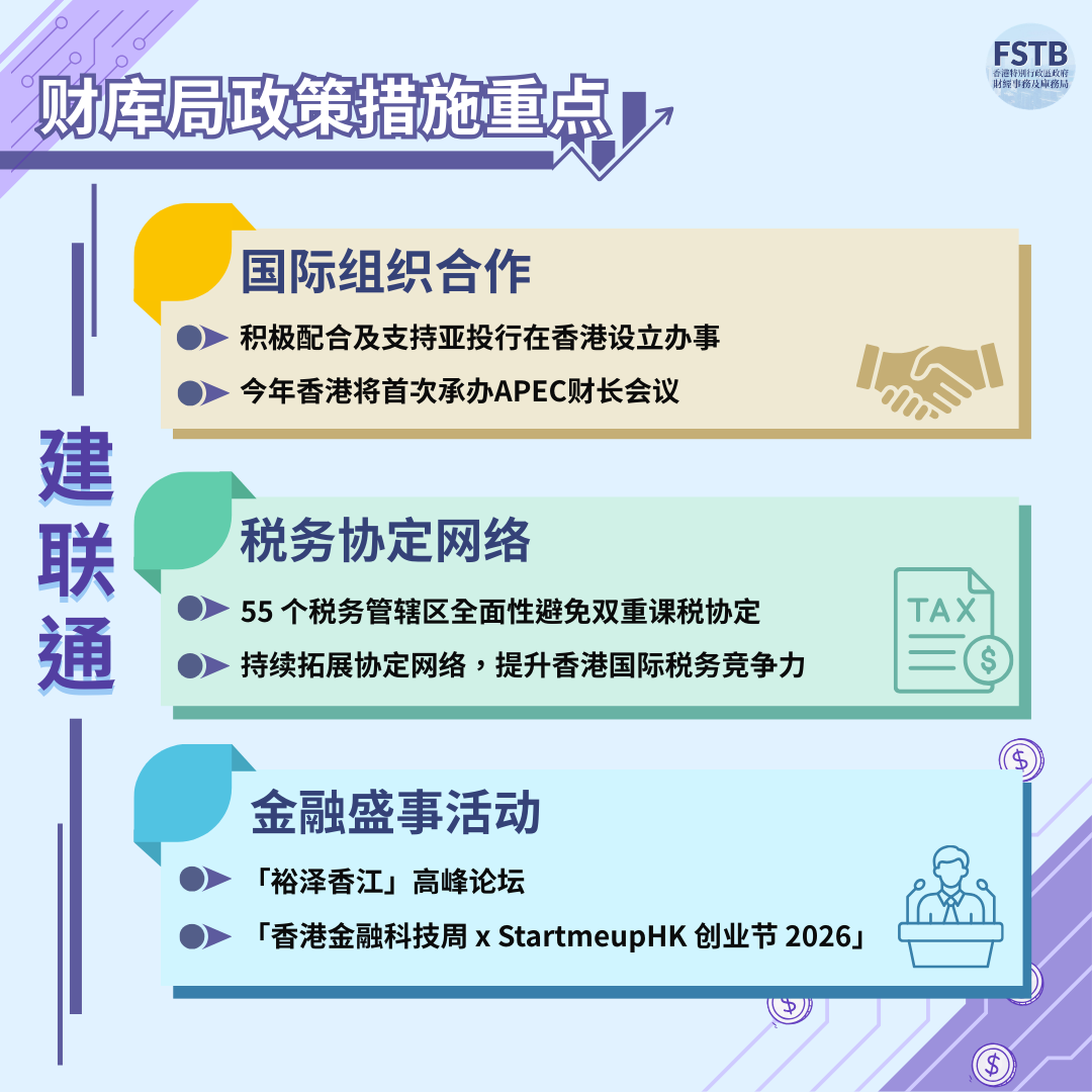 在「建聯通」上,香港正積極配合亞投行在港設辦事處,並將首次承辦亞太經合組織財長會議。香港已與55個稅務管轄區簽訂全面性避免雙重課稅協定,網絡將持續拓展。香港會積極舉辦金融盛事活動,如下月底舉行的「裕澤香江」高峰論壇。