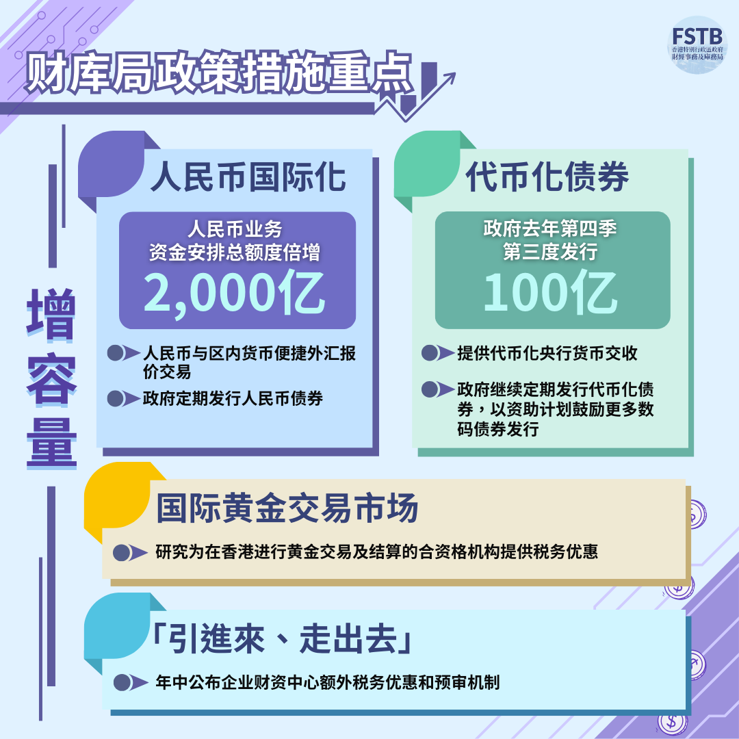 為「增容量」,將推出一系列稅務及拓展產品措施。人民幣業務資金安排總額度已倍增至2,000億元。將優化基金及家族辦公室稅制,將數字資產、貴金屬等納入合資格投資。政府將繼續加強宣傳吸引企業遷冊、定期發行代幣化債券,並鼓勵更多數碼債券發行。亦會研究為黃金交易及結算提供稅務優惠。