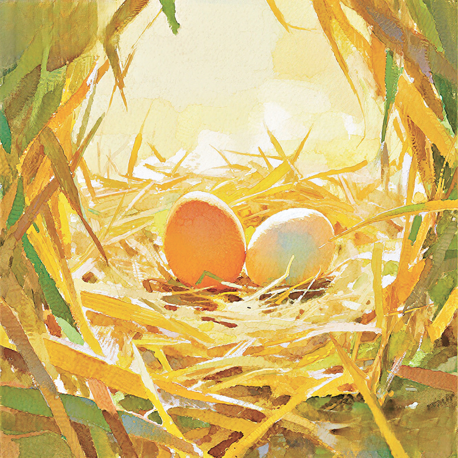 我矮下身,透過籬笆縫看:「花花」蹲在自己用乾草搭的小窩上,旁邊赫然臥着三枚光溜溜的雞蛋!