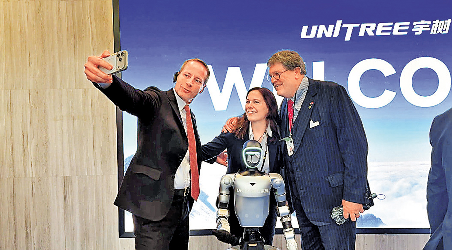 在杭州宇樹科技參觀期間,默茨一行觀看了人形機器人寫「福」字、表演拳擊和武術,以及在工廠和家庭場景中的應用展示,全程興趣滿滿。德企高管們也對宇樹機器人連連點讚,不僅排隊與機器人合照留念,荷貝克電源系統首席執行官Marc Zoellner還牽起機器人的手「共舞」一曲,站在一旁的代表團成員還打趣說道:「別把它弄壞了,它很貴的。」
